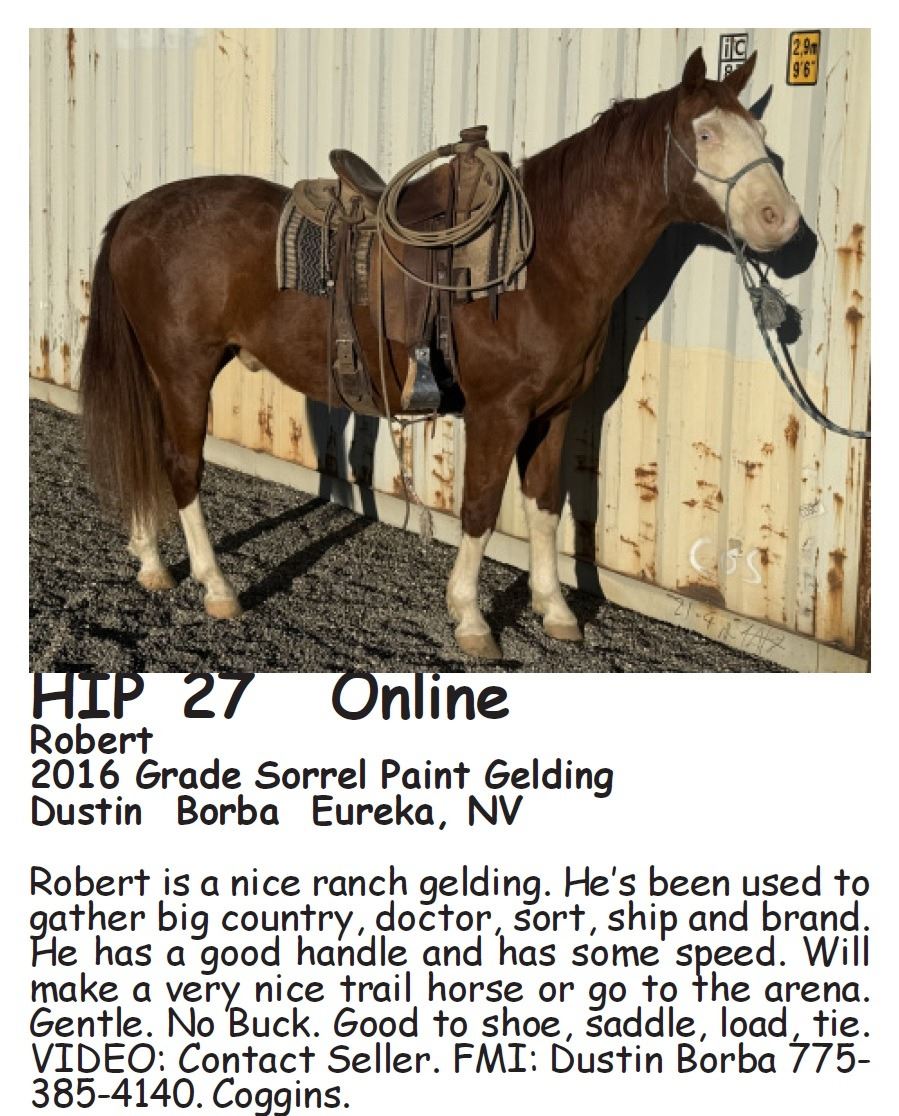 Robert is a nice ranch gelding. He’s been used to gather big country, doctor, sort, ship and brand. He has a good handle and has some speed. Will make a very nice trail horse or go to the arena. Gentle. No Buck. Good to shoe, saddle, load, tie. VIDEO: Contact Seller. FMI: Dustin Borba 775-385-4140. Coggins.
