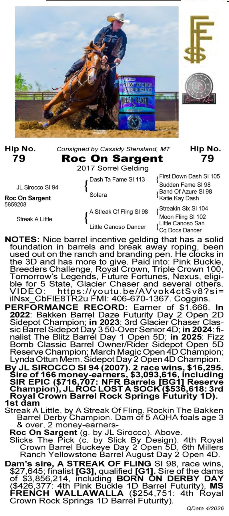 Roc On Sargent -5859208 - 2017 AQHA Sorrel Gelding - Cassidy Stensland, Worden, MT - Nice barrel incentive gelding that has a solid foundation in barrels and break away roping, been used out on the ranch and branding pen. He clocks in the 3D and has more to give. Paid into: Pink Buckle, Breeders Challenge, Royal Crown, Triple Crown 100, Tomorrow's Legends, Future Fortunes, Nexus, eligible for 5 State, Glacier Chaser and several others. VIDEO: https://youtu.be/AVvok4ctSv8?si=ilNsx_CbFlE8TR2u FMI: 406-670-1367. Coggins.