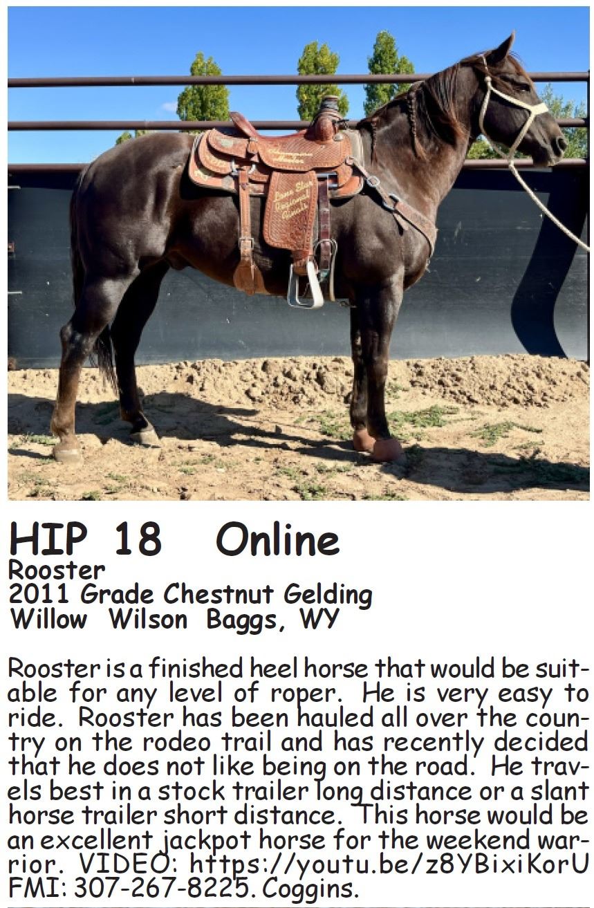 Rooster is a finished heel horse that would be suitable for any level of roper. He is very easy to ride. Rooster has been hauled all over the country on the rodeo trail and has recently decided that he does not like being on the road. He travels best in a stock trailer long distance or a slant horse trailer short distance. This horse would be an excellent jackpot horse for the weekend warrior. VIDEO: https://youtu.be/z8YBixiKorU FMI: 307-267-8225. Coggins.