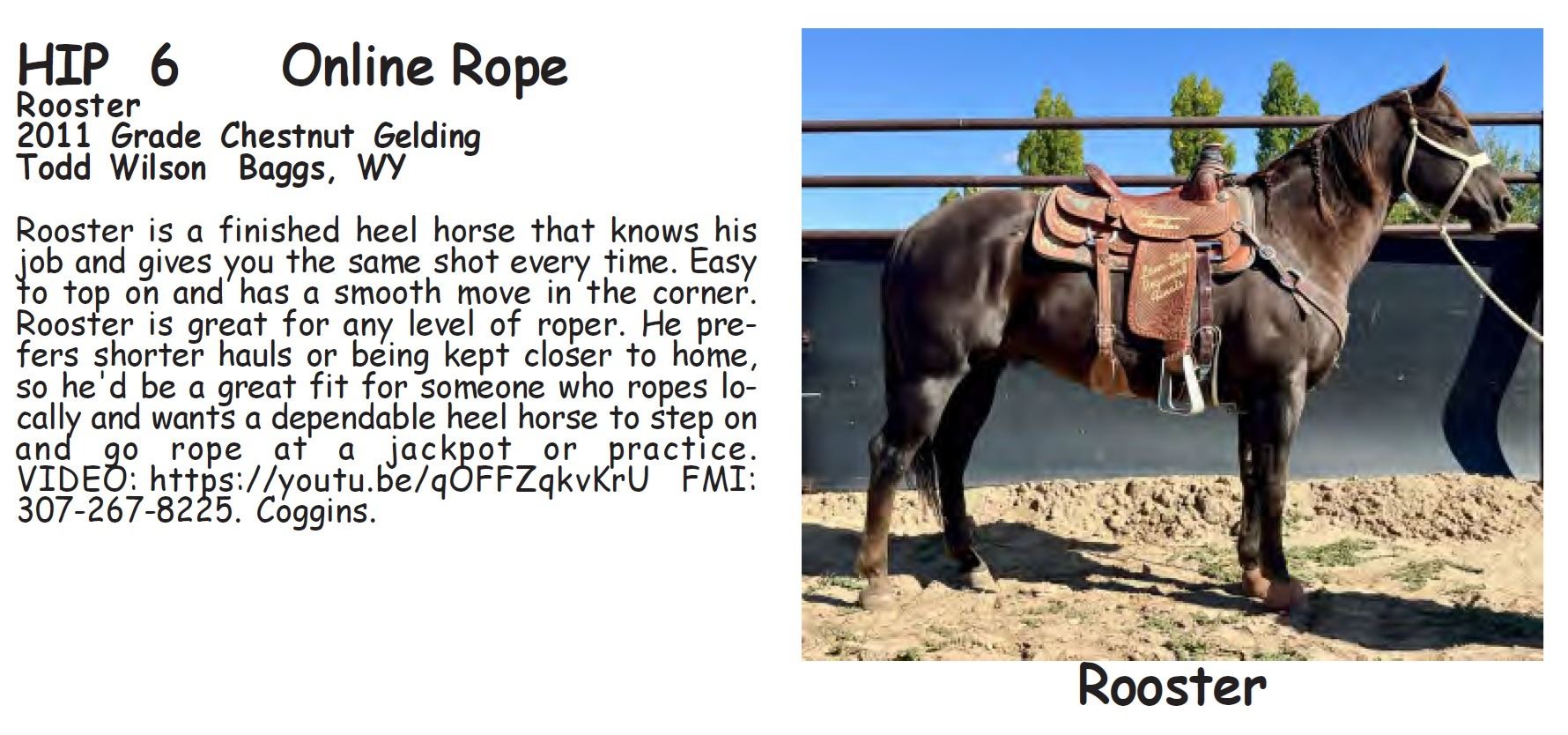 Rooster - 2011 Grade Chestnut Gelding - Todd Wilson, Baggs, WY - Rooster is a finished heel horse that knows his job and gives you the same shot every time. Easy to top on and has a smooth move in the corner. Rooster is great for any level of roper. He prefers shorter hauls or being kept closer to home, so he'd be a great fit for someone who ropes locally and wants a dependable heel horse to step on and go rope at a jackpot or practice. VIDEO: https://youtu.be/qOFFZqkvKrU FMI: 307-267-8225. Coggins.