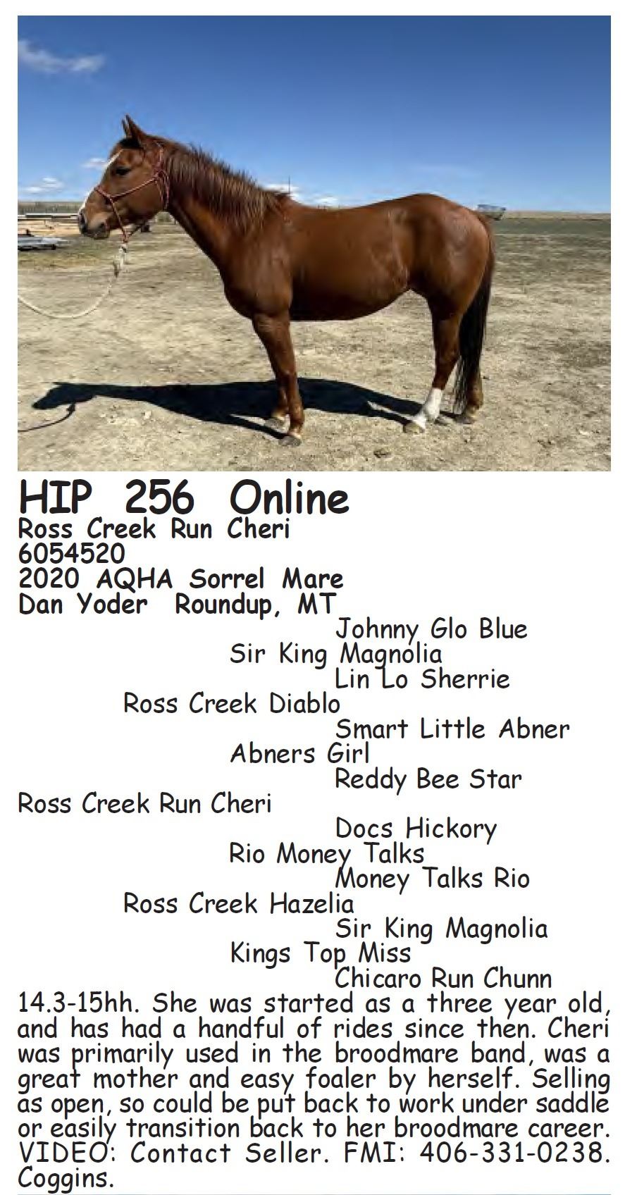 Ross Creek Run Cheri - 6054520 - 2020 AQHA Sorrel Mare - Dan Yoder, Roundup, MT - 14.3-15hh. She was started as a three year old, and has had a handful of rides since then. Cheri was primarily used in the broodmare band, was a great mother and easy foaler by herself. Selling as open, so could be put back to work under saddle or easily transition back to her broodmare career. VIDEO: Contact Seller. FMI: 406-331-0238. Coggins.