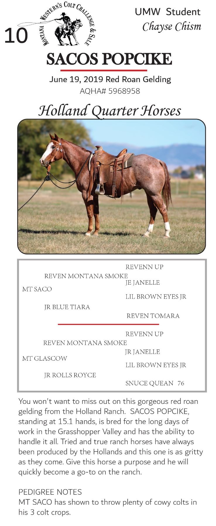 You won't want to miss out on this gorgeous red roan gelding from the Holland Ranch. Sacos Popcike, standing at 15.1 hands, is bred for the long days of work in the Grasshopper Valley and has the ability to handle it all. Tried and true ranch horses have always been produced by the Hollands and this one is as gritty as they come. Give this horse a purpose and he will quickly become a go-to on the ranch.
