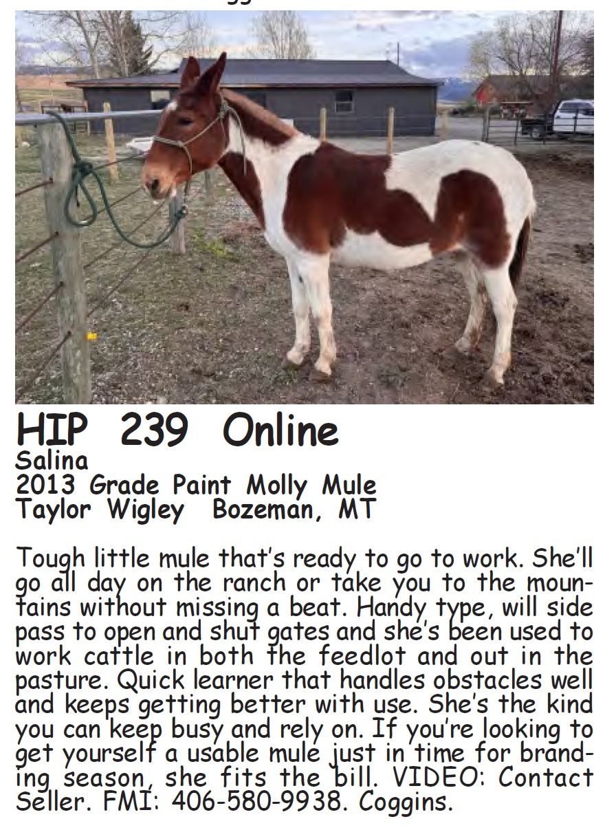 Salina - 2013 Grade Paint Molly Mule - Taylor Wigley, Bozeman, MT - Tough little mule that’s ready to go to work. She’ll go all day on the ranch or take you to the mountains without missing a beat. Handy type, will side pass to open and shut gates and she’s been used to work cattle in both the feedlot and out in the pasture. Quick learner that handles obstacles well and keeps getting better with use. She’s the kind you can keep busy and rely on. If you’re looking to get yourself a usable mule just in time for branding season, she fits the bill. VIDEO: Contact Seller. FMI: 406-580-9938. Coggins.