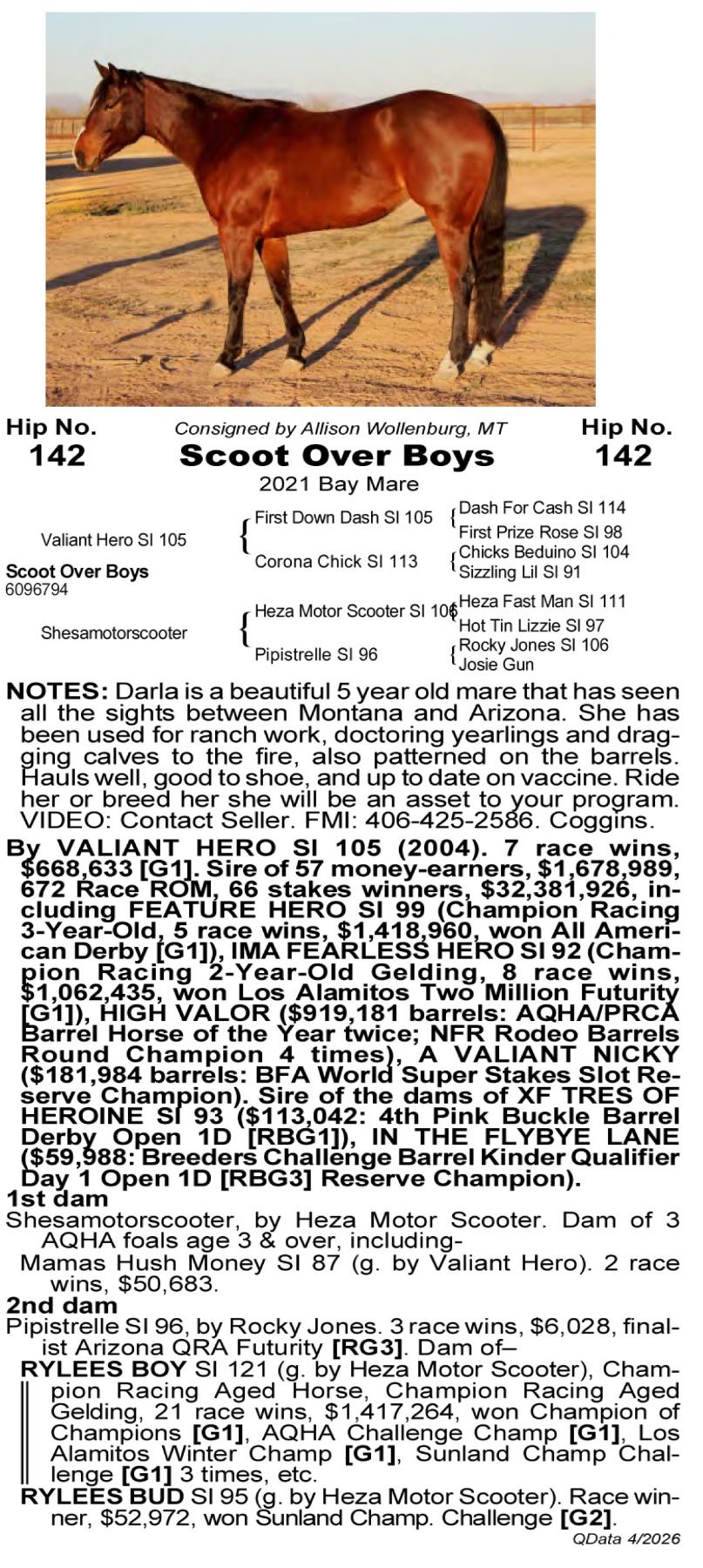 Scoot Over Boys -6096794 - 2021 AQHA Bay Mare - Allison Wollenburg, Columbus, MT - Darla is a beautiful 5 year old mare that has seen all the sights between Montana and Arizona. She has been used for ranch work doctoring yearlings and dragging calves to the fire, also patterned on the barrels. Hauls well, good to shoe, and up to date on vaccine. Ride her or breed her she will be an asset to your program. By VALIANT HERO SI 105 (2004) 7 race wins, $668,633, won Texas Classic Futurity [G2], Heritage Place Derby[G2], Dash For Cash Juv. S[R]. Sire of 47 money-earners, $1,474,392,622 race ROM, 62 Stakes winners, $31,928,667. VIDEO: Contact Seller. FMI: 406-425-2586. Coggins.