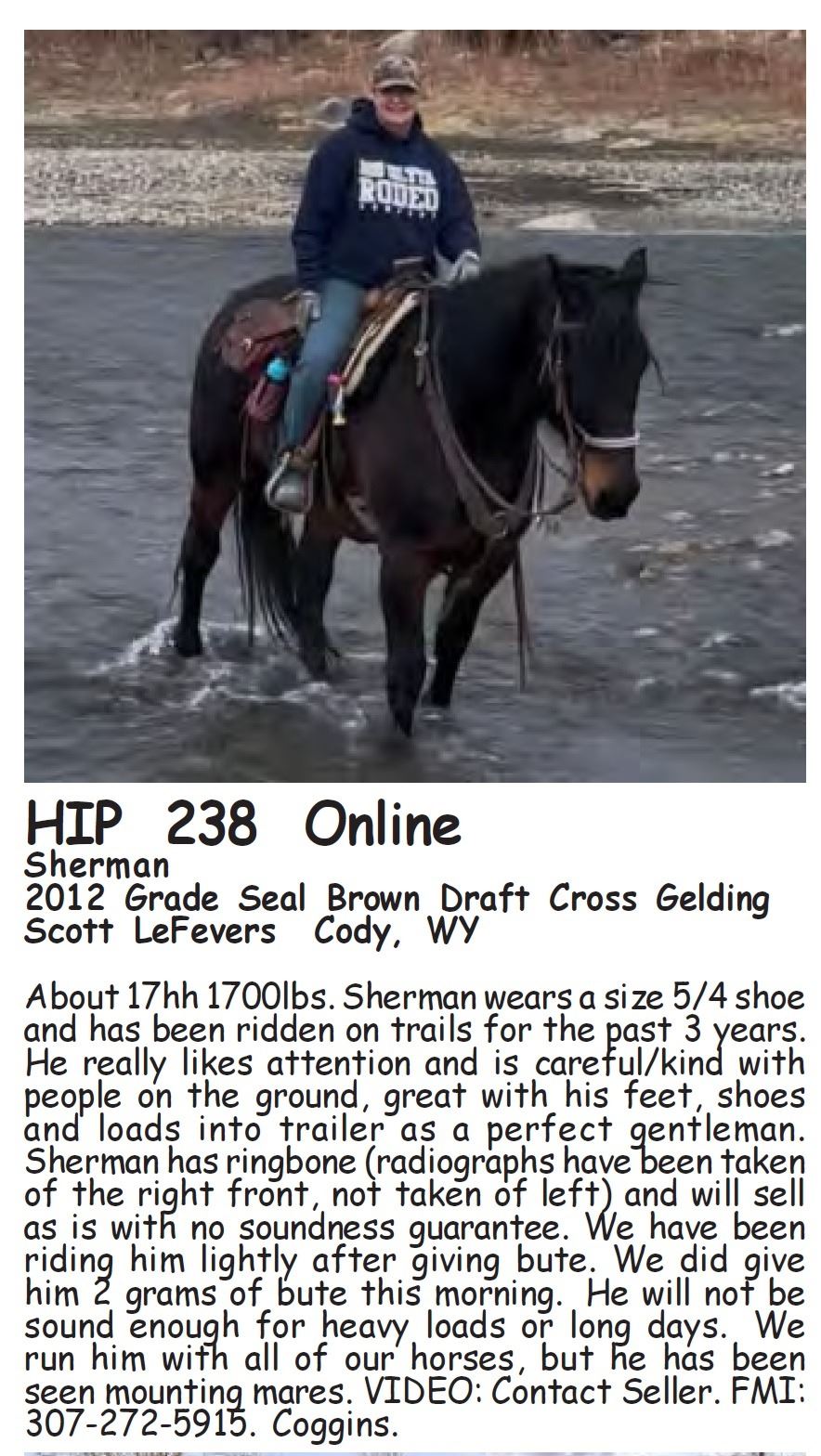 Sherman - 2012 Grade Seal Brown Draft Cross Gelding - Scott LeFevers, Cody, WY - About 17hh 1700lbs. Sherman wears a size 5/4 shoe and has been ridden on trails for the past 3 years. He really likes attention and is careful/kind with people on the ground, great with his feet, shoes and loads into trailer as a perfect gentleman. Sherman has ringbone (radiographs have been taken of the right front, not taken of left) and will sell as is with no soundness guarantee. We have been riding him lightly after giving bute. We did give him 2 grams of bute this morning. He will not be sound enough for heavy loads or long days. We run him with all of our horses, but he has been seen mounting mares. VIDEO: Contact Seller. FMI: 307-272-5915. Coggins.