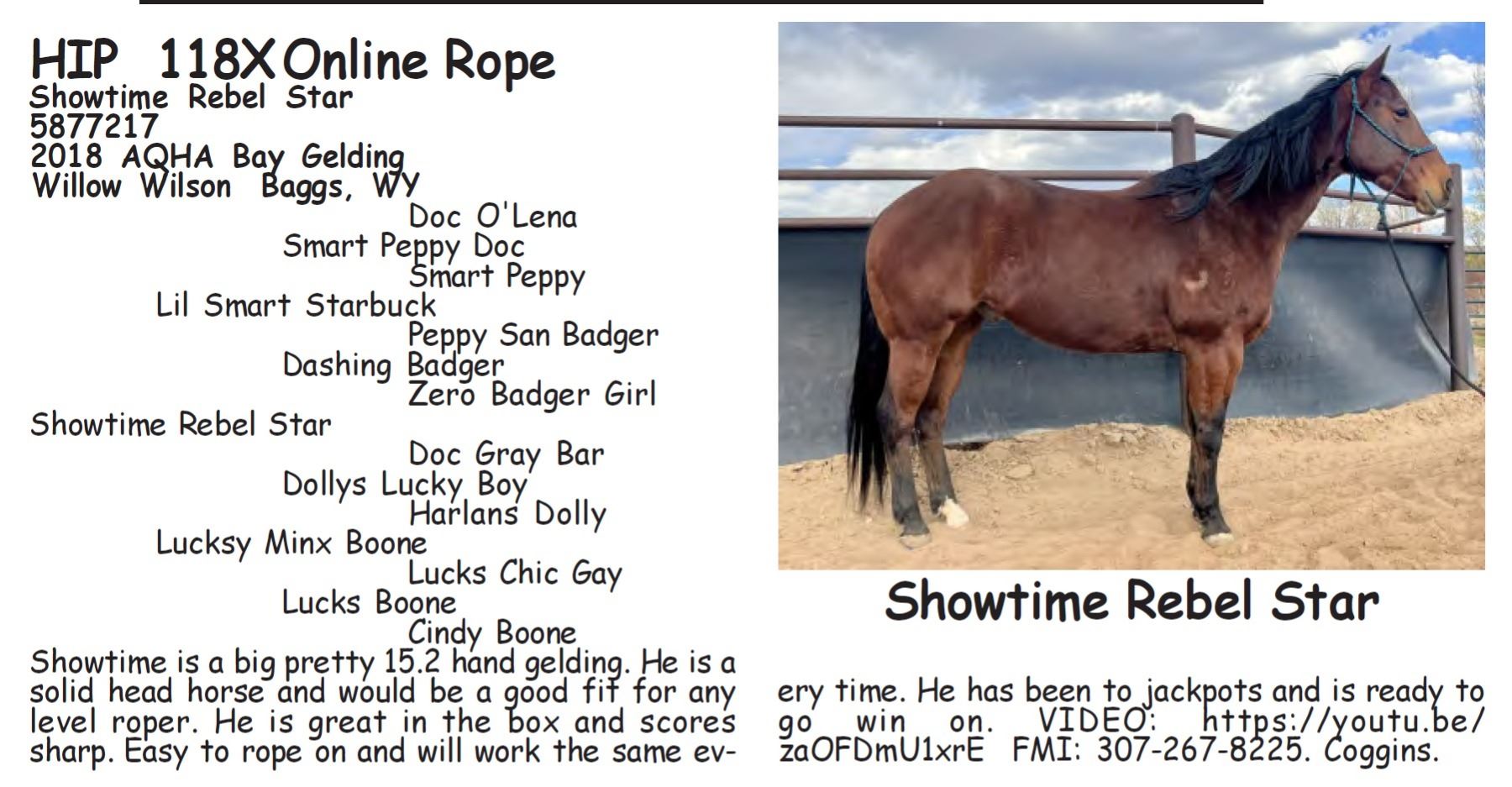 Showtime Rebel Star - 5877217 - 2018 AQHA Bay Gelding - Willow Wilson, Baggs, WY - Showtime is a big pretty 15.2 hand gelding. He is a solid head horse and would be a good fit for any level roper. He is great in the box and scores sharp. Easy to rope on and will work the same every time. He has been to jackpots and is ready to go win on. VIDEO: https://youtu.be/zaOFDmU1xrE FMI: 307-267-8225. Coggins.