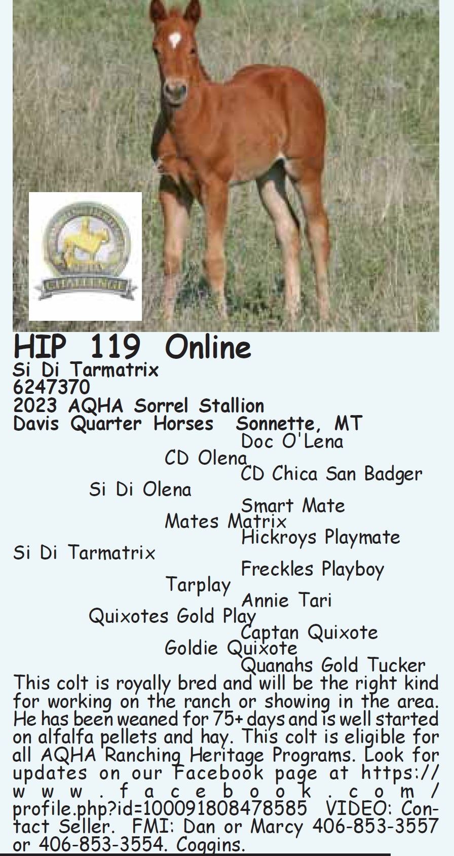 ALL OCTOBER 27-28 SALE HORSES WILL BE AUCTIONED LIVE AT BILLINGS LIVESTOCK – Internet bidding also available for Online/ ShowCase Internet Sale Session horses offered in this sale
