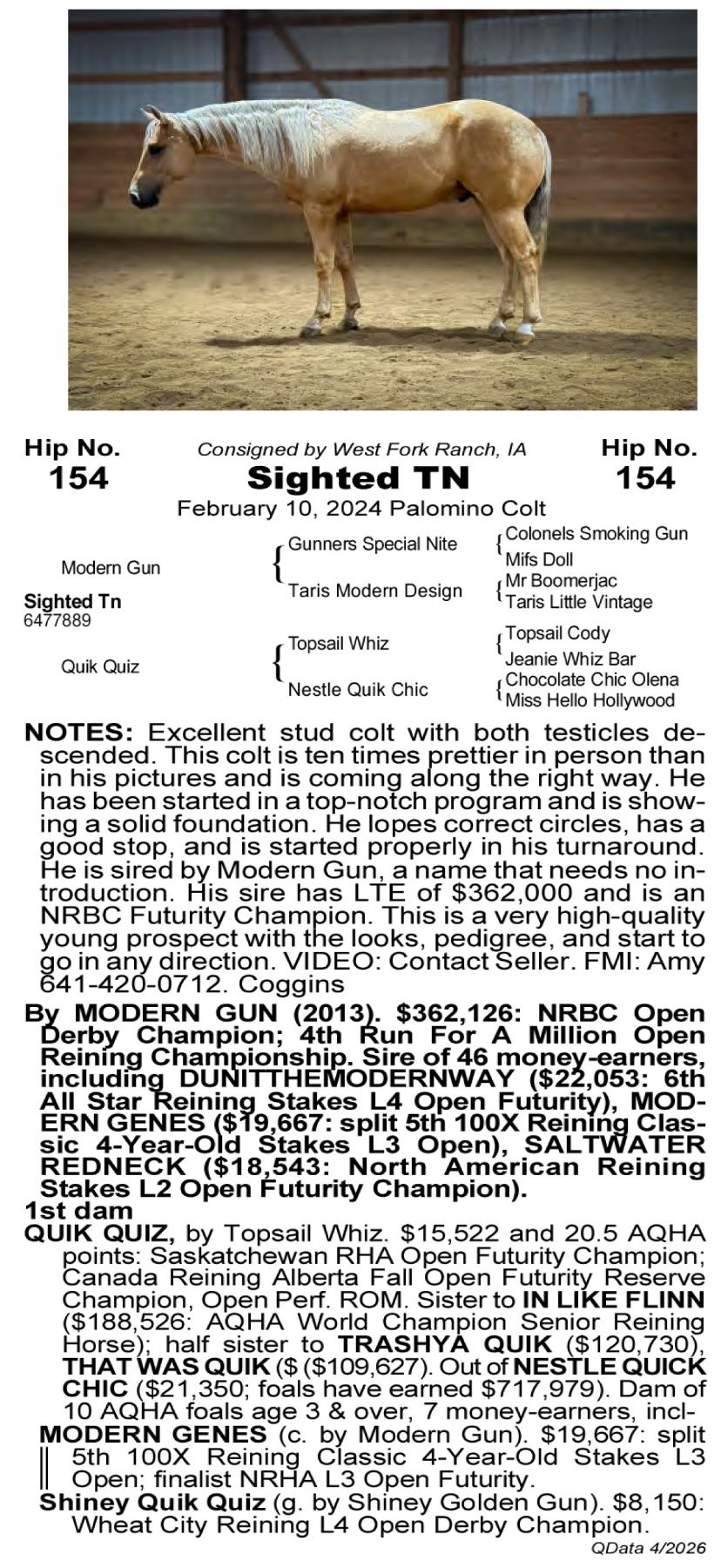 Sighted TN - 6477889 - 2024 AQHA Palomino Stallion - West Fork Ranch, Sheffield, IA - Excellent stud colt with both testicles descended. This colt is ten times prettier in person than in his pictures and is coming along the right way. He has been started in a top-notch program and is showing a solid foundation. He lopes correct circles, has a good stop, and is started properly in his turnaround. He is sired by Modern Gun, a name that needs no introduction. His sire has LTE of $362,000 and is an NRBC Futurity Champion. This is a very high-quality young prospect with the looks, pedigree, and start to go in any direction. VIDEO: Contact Seller. FMI: Amy 641-420-0712. Coggins.