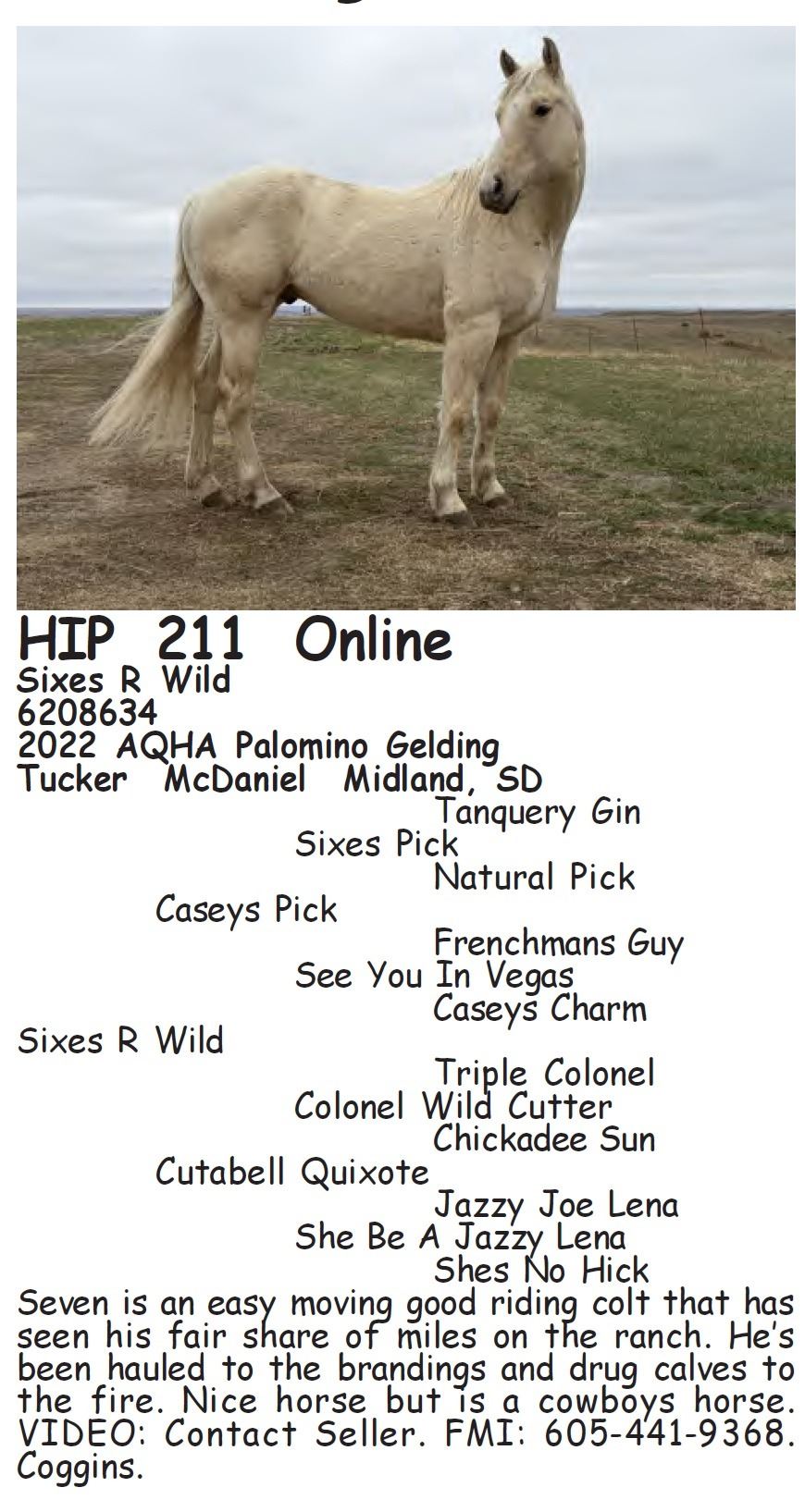 Sixes R Wild - 6208634 - 2022 AQHA Palomino Gelding - Tucker McDaniel, Midland, SD - Seven is an easy moving good riding colt that has seen his fair share of miles on the ranch. He’s been hauled to the brandings and drug calves to the fire. Nice horse but is a cowboys horse. VIDEO: Contact Seller. FMI: 605-441-9368. Coggins.