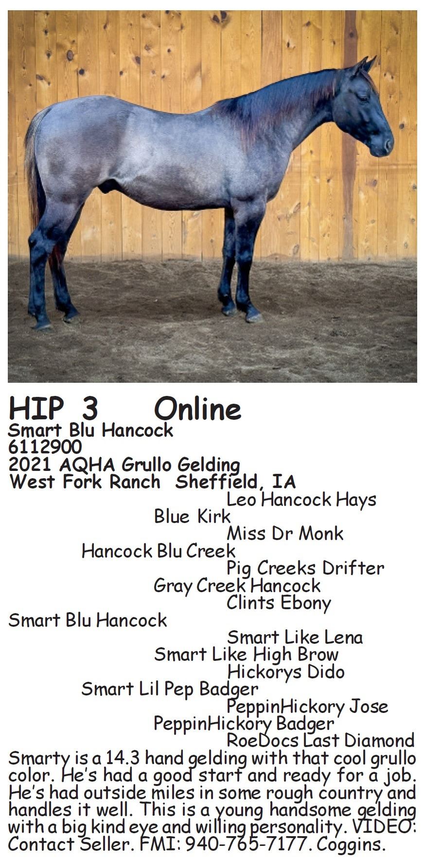 2021 AQHA Grullo Gelding x Hancock Blu Creek x Blue Kirk out of Smart Lil Pep Badger x Smart Like High Brow. Smarty is a 14.3 hand gelding with that cool grullo color. He’s had a good start and ready for a job. He’s had outside miles in some rough country and handles it well. This is a young handsome gelding with a big kind eye and willing personality. VIDEO: Contact Seller. FMI: 940-765-7177. Coggins.