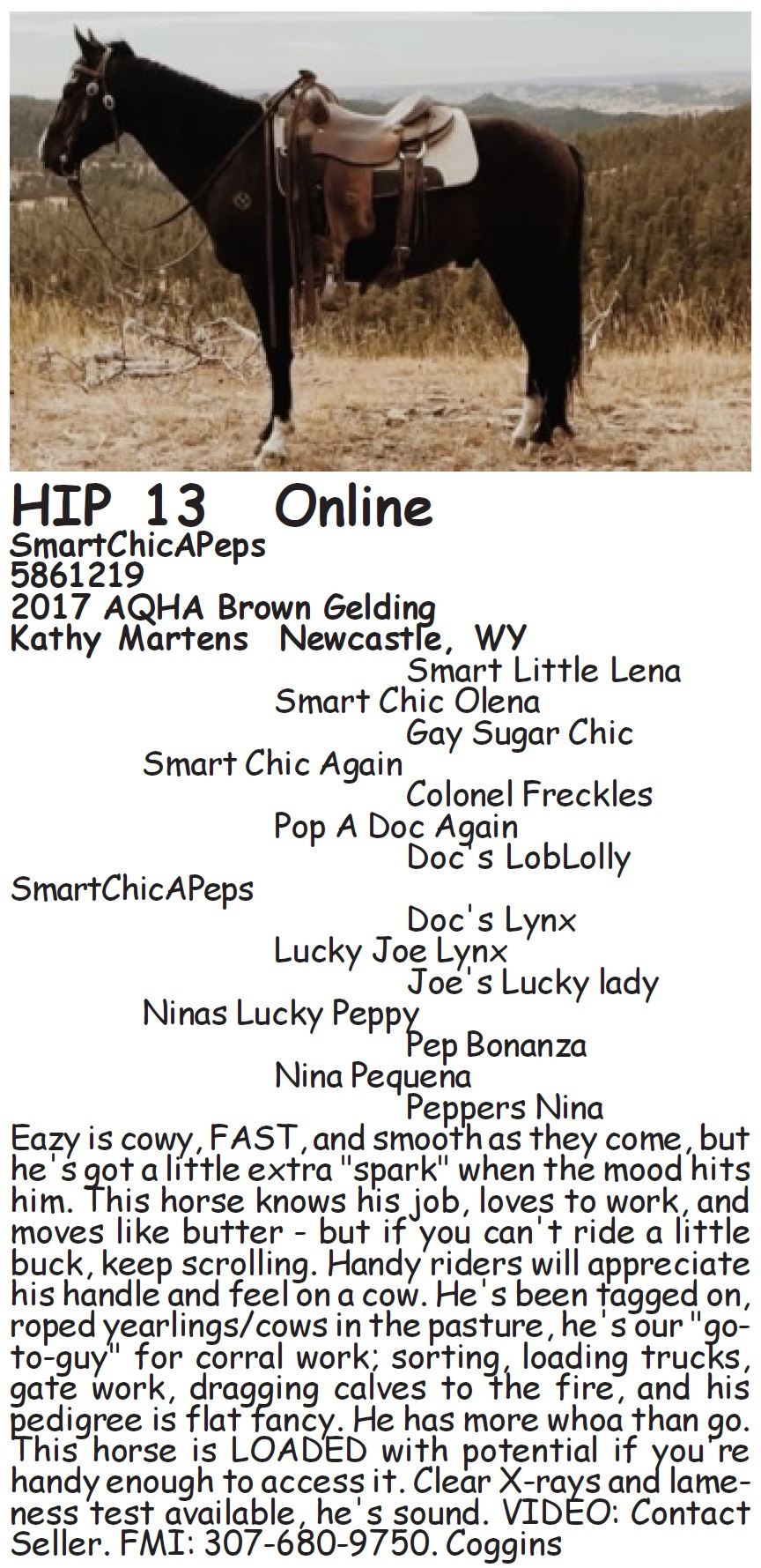 2017 AQHA Brown Gelding x Smart Chic Again x Smart Chic Olena out of Ninas Lucky Peppy x Lucky Joe Lynx. Eazy is cowy, FAST, and smooth as they come, but he's got a little extra "spark" when the mood hits him. This horse knows his job, loves to work, and moves like butter - but if you can't ride a little buck, keep scrolling. Handy riders will appreciate his handle and feel on a cow. He's been tagged on, roped yearlings/cows in the pasture, he's our "go-to-guy" for corral work; sorting, loading trucks, gate work, dragging calves to the fire, and his pedigree is flat fancy. He has more whoa than go. This horse is LOADED with potential if you're handy enough to access it. Clear X-rays and lameness test available, he's sound. VIDEO: Contact Seller. FMI: 307-680-9750. Coggins.