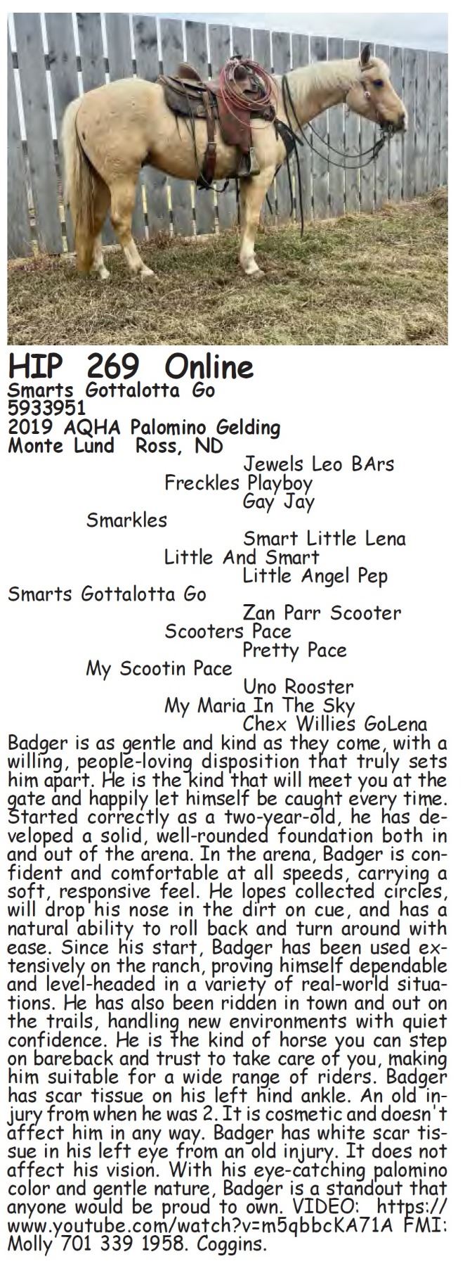 Smarts Gottalotta Go - 5933951 - 2019 AQHA Palomino Gelding - Monte Lund, Ross, ND - Badger is as gentle and kind as they come, with a willing, people-loving disposition that truly sets him apart. He is the kind that will meet you at the gate and happily let himself be caught every time. Started correctly as a two-year-old, he has developed a solid, well-rounded foundation both in and out of the arena. In the arena, Badger is confident and comfortable at all speeds, carrying a soft, responsive feel. He lopes collected circles, will drop his nose in the dirt on cue, and has a natural ability to roll back and turn around with ease. Since his start, Badger has been used extensively on the ranch, proving himself dependable and level-headed in a variety of real-world situations. He has also been ridden in town and out on the trails, handling new environments with quiet confidence. He is the kind of horse you can step on bareback and trust to take care of you, making him suitable for a wide range of riders. Badger has scar tissue on his left hind ankle. An old injury from when he was 2. It is cosmetic and doesn't affect him in any way. Badger has white scar tissue in his left eye from an old injury. It does not affect his vision. With his eye-catching palomino color and gentle nature, Badger is a standout that anyone would be proud to own. VIDEO: https://www.youtube.com/watch?v=m5qbbcKA71A FMI: Molly 701 339 1958. Coggins.