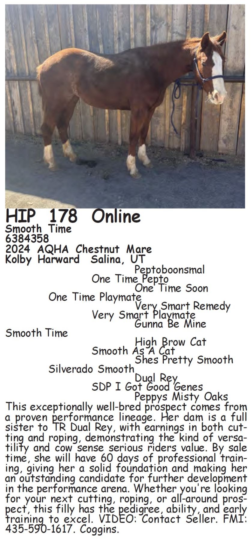 Smooth Time - 6384358 - 2024 AQHA Chestnut Mare - Kolby Harward, Salina, UT - This exceptionally well-bred prospect comes from a proven performance lineage. Her dam is a full sister to TR Dual Rey, with earnings in both cutting and roping, demonstrating the kind of versatility and cow sense serious riders value. By sale time, she will have 60 days of professional training, giving her a solid foundation and making her an outstanding candidate for further development in the performance arena. Whether you're looking for your next cutting, roping, or all-around prospect, this filly has the pedigree, ability, and early training to excel. VIDEO: Contact Seller. FMI: 435-590-1617. Coggins.