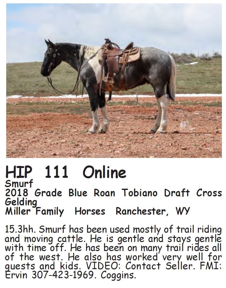 Smurf - 2018 Grade Blue Roan Tobiano Draft Cross Gelding - Miller Family Horses, Ranchester, WY - 15.3hh. Smurf has been used mostly of trail riding and moving cattle. He is gentle and stays gentle with time off. He has been on many trail rides all of the west. He also has worked very well for guests and kids. VIDEO: Contact Seller. FMI: Ervin 307-423-1969. Coggins.