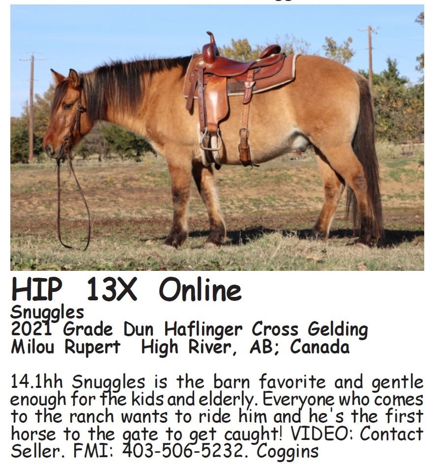 14.1hh Snuggles is the barn favorite and gentle enough for the kids and elderly. Everyone who comes to the ranch wants to ride him and he's the first horse to the gate to get caught! VIDEO: Contact Seller. FMI: 403-506-5232. Coggins