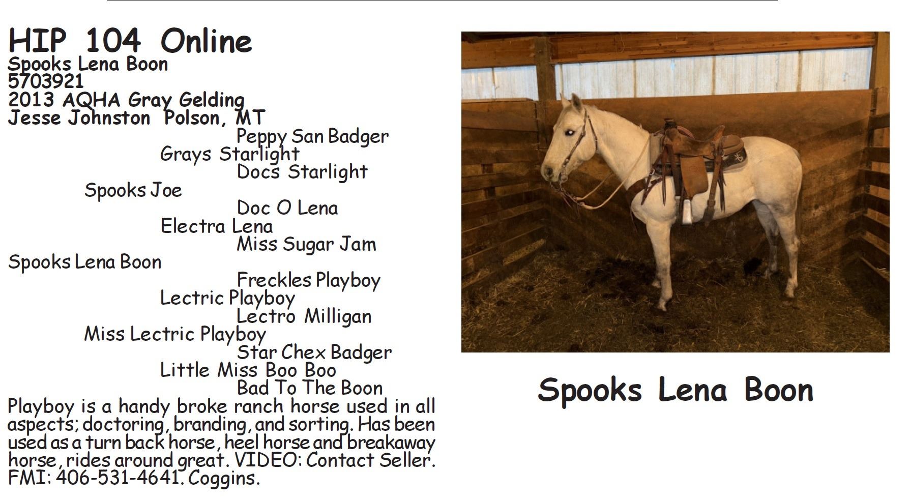 2013 AQHA Gray Gelding x Spooks Joe x Grays Starlight out of Miss Lectric Playboy x Lectric Playboy. Playboy is a handy broke ranch horse used in all aspects; doctoring, branding, and sorting. Has been used as a turn back horse, heel horse and breakaway horse, rides around great. VIDEO: Contact Seller. FMI: 406-531-4641. Coggins