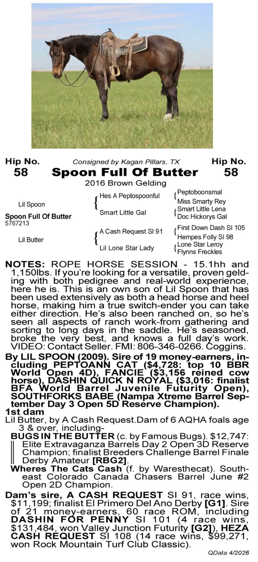 Spoon Full Of Butter - 5767213 - 2016 AQHA Bay Gelding - Kagan Pillars, Canyon, TX - 15.1hh 1150lbs. If you’re looking for a versatile, proven gelding with both pedigree and real-world experience, here he is. This is an own son of Lil Spoon that has been used extensively as both a head horse and heel horse, making him a true switch-ender you can take either direction. He’s also been ranched on, so he’s seen all aspects of ranch work—from gathering and sorting to long days in the saddle. He’s seasoned, broke the very best, and knows a full day’s work. VIDEO: Contact Seller. FMI: 806-346-0266. Coggins.