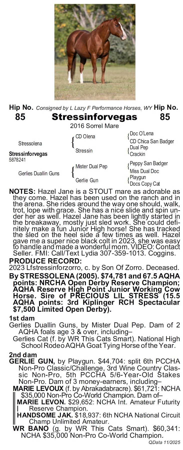2016 AQHA Sorrel Mare x StressOlena x CD Olena out of Gerlies Duallin Guns x Mister Dual Pep. Hazel Jane is a STOUT mare as adorable as they come. She is by Stressolena (LTE $74,781 - 67.5 AQHA points) out of Gerlies Duallin Guns (Mister Dual Pep x Gerlin Gun) with this pedigree she is made to last. Hazel has been used on the ranch and in the arena. She rides around the way one should,walk, trot, lope with grace. She has a nice slide and spin under her as well. Hazel Jane has been lightly started in the breakaway, mostly just sled work. She could definatley make a fun Junior High horse! She has tracked the sled on the heel side a few times as well. Hazel gave me a super nice black colt in 2023, shw was easy to handle and mae a wonderful mom. VIDEO: Contact Seller. FMI: Call/Text Lydia 307-359-1013. Coggins.