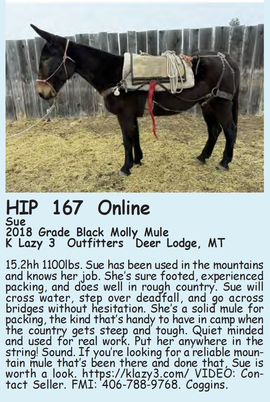 Sue - 2018 Grade Black Molly Mule - K Lazy 3 Outfitters, Deer Lodge, MT - 15.2hh 1100lbs. Sue has been used in the mountains and knows her job. She’s sure footed, experienced packing, and does well in rough country. Sue will cross water, step over deadfall, and go across bridges without hesitation. She’s a solid mule for packing, the kind that’s handy to have in camp when the country gets steep and tough. Quiet minded and used for real work. Put her anywhere in the string! Sound. If you’re looking for a reliable mountain mule that’s been there and done that, Sue is worth a look. https://klazy3.com/ VIDEO: Contact Seller. FMI: 406-788-9768. Coggins.