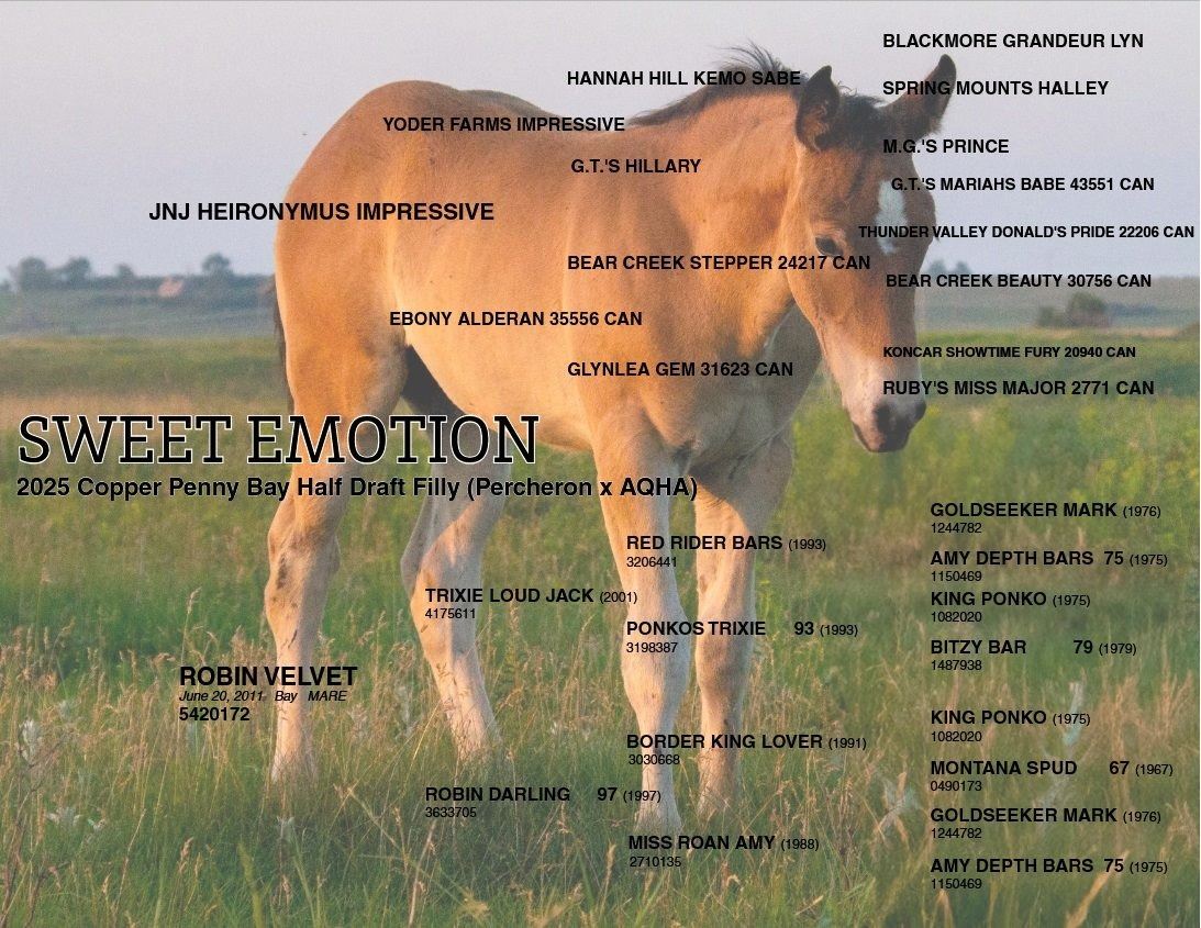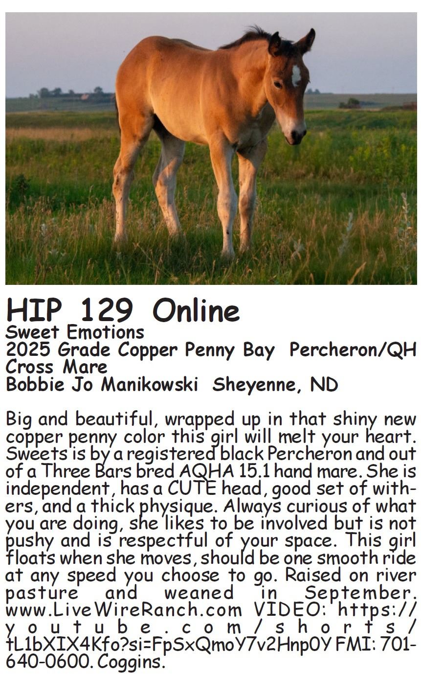 Big and beautiful, wrapped up in that shiny new copper penny color this girl will melt your heart. Sweets is by a registered black Percheron and out of a Three Bars bred AQHA 15.1 hand mare. She is independent, has a CUTE head, good set of withers, and a thick physique. Always curious of what you are doing, she likes to be involved but is not pushy and is respectful of your space. This girl floats when she moves, should be one smooth ride at any speed you choose to go. Raised on river pasture and weaned in September. www.LiveWireRanch.com VIDEO: https://youtube.com/shorts/tL1bXIX4Kfo?si=FpSxQmoY7v2Hnp0Y FMI: 701-640-0600. Coggins.