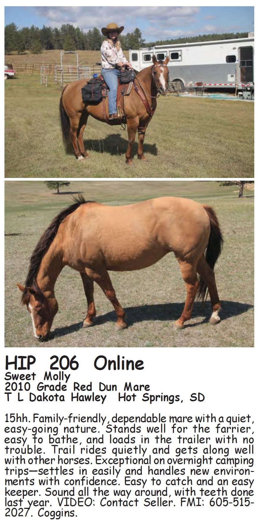 Sweet Molly - 2010 Grade Red Dun Mare - T L Dakota Hawley, Hot Springs, SD - 15hh. Family-friendly, dependable mare with a quiet, easy-going nature. Stands well for the farrier, easy to bathe, and loads in the trailer with no trouble. Trail rides quietly and gets along well with other horses. Exceptional on overnight camping trips—settles in easily and handles new environments with confidence. Easy to catch and an easy keeper. Sound all the way around, with teeth done last year. VIDEO: Contact Seller. FMI: 605-515-2027. Coggins.
