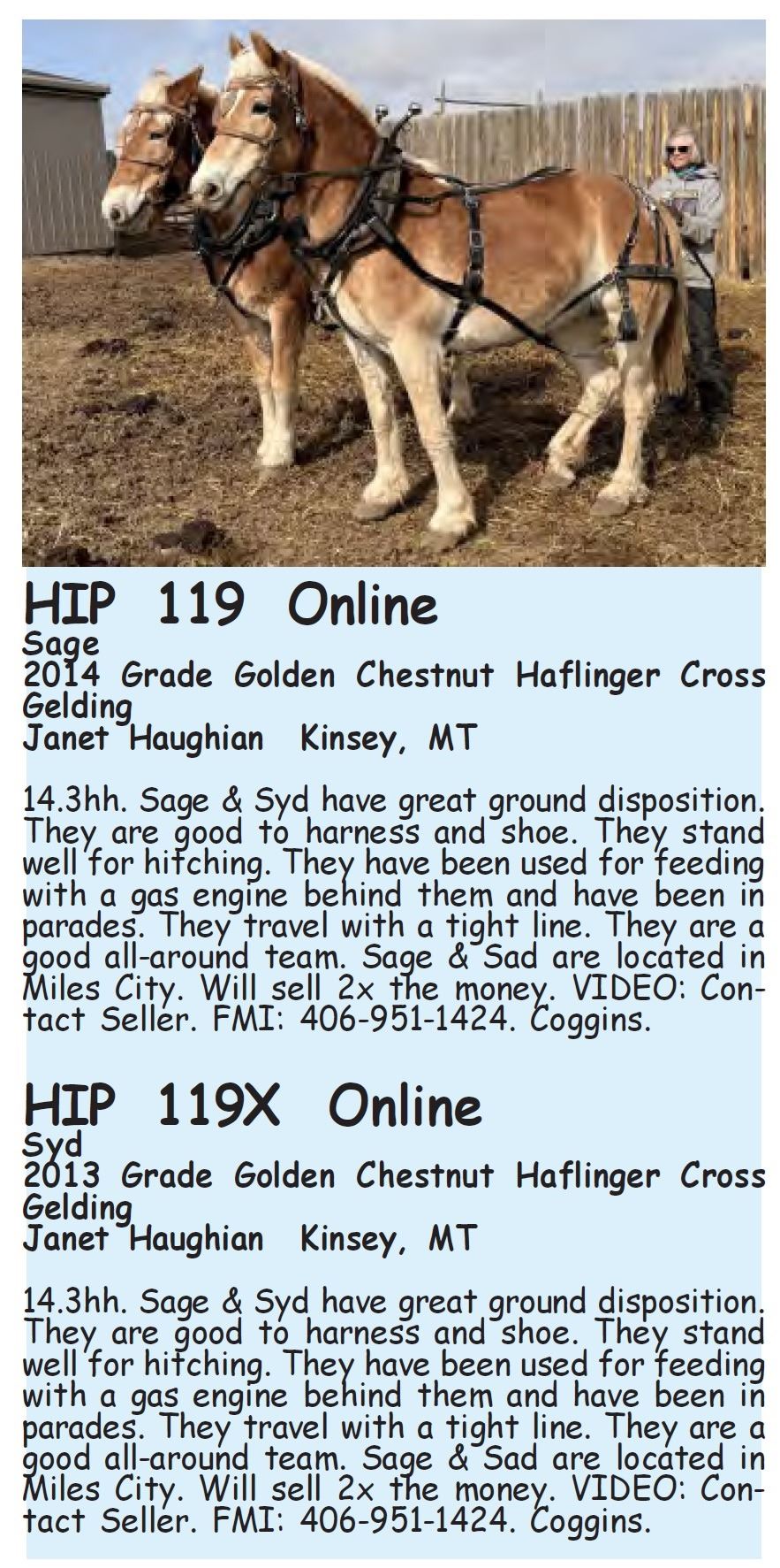 Syd - 2013 Grade Golden Chestnut Haflinger Cross Gelding - Janet Haughian, Kinsey, MT - 14.3hh. Sage & Syd have great ground disposition. They are good to harness and shoe. They stand well for hitching. They have been used for feeding with a gas engine behind them and have been in parades. They travel with a tight line. They are a good all-around team. Sage & Sad are located in Miles City. Will sell 2x the money. VIDEO: Contact Seller. FMI: 406-951-1424. Coggins.
