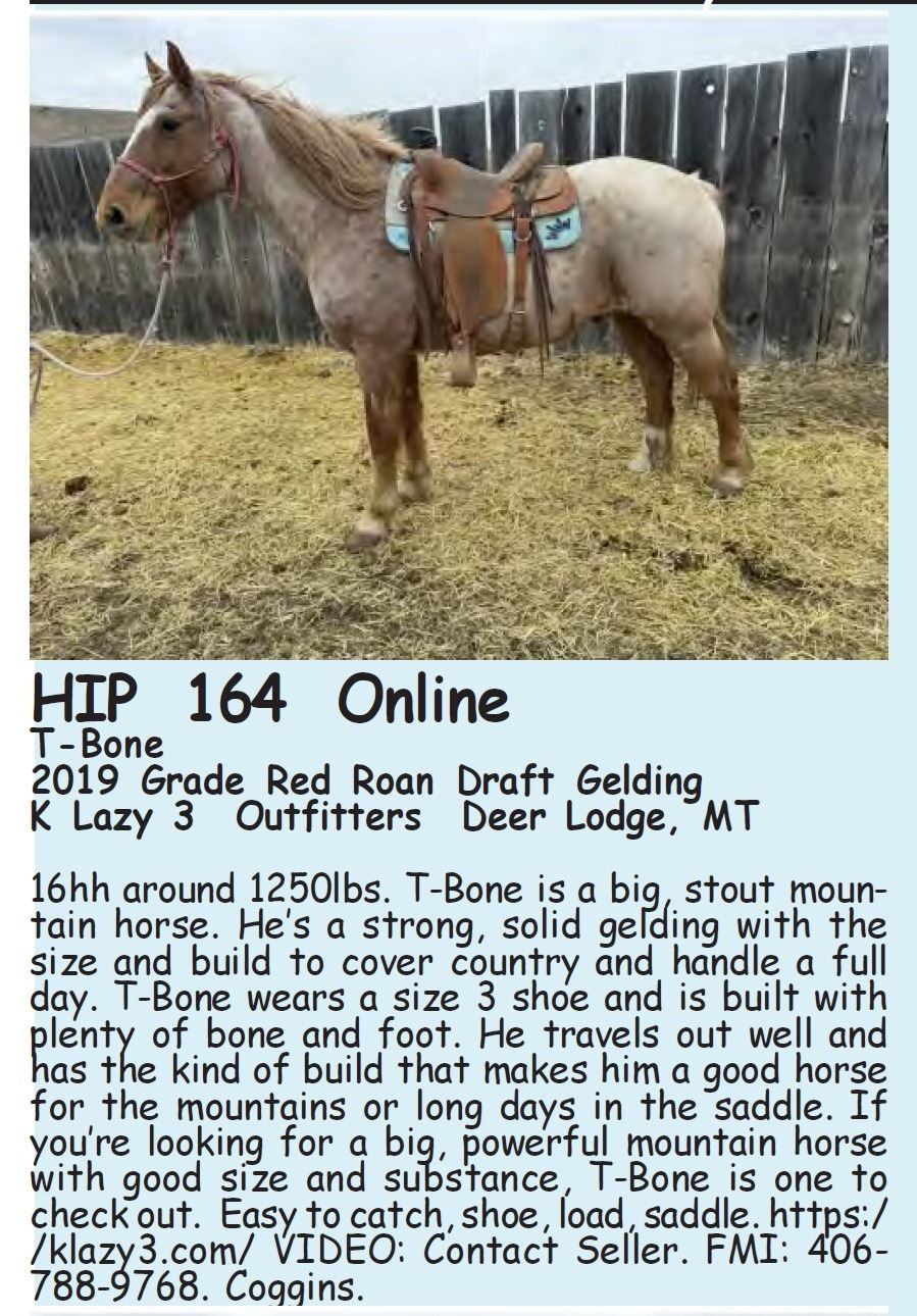 T-Bone - 2019 Grade Red Roan Draft Gelding - K Lazy 3 Outfitters, Deer Lodge, MT - 16hh around 1250lbs. T-Bone is a big, stout mountain horse. He’s a strong, solid gelding with the size and build to cover country and handle a full day. T-Bone wears a size 3 shoe and is built with plenty of bone and foot. He travels out well and has the kind of build that makes him a good horse for the mountains or long days in the saddle. If you’re looking for a big, powerful mountain horse with good size and substance, T-Bone is one to check out. Easy to catch, shoe, load, saddle. https://klazy3.com/ VIDEO: Contact Seller. FMI: 406-788-9768. Coggins.