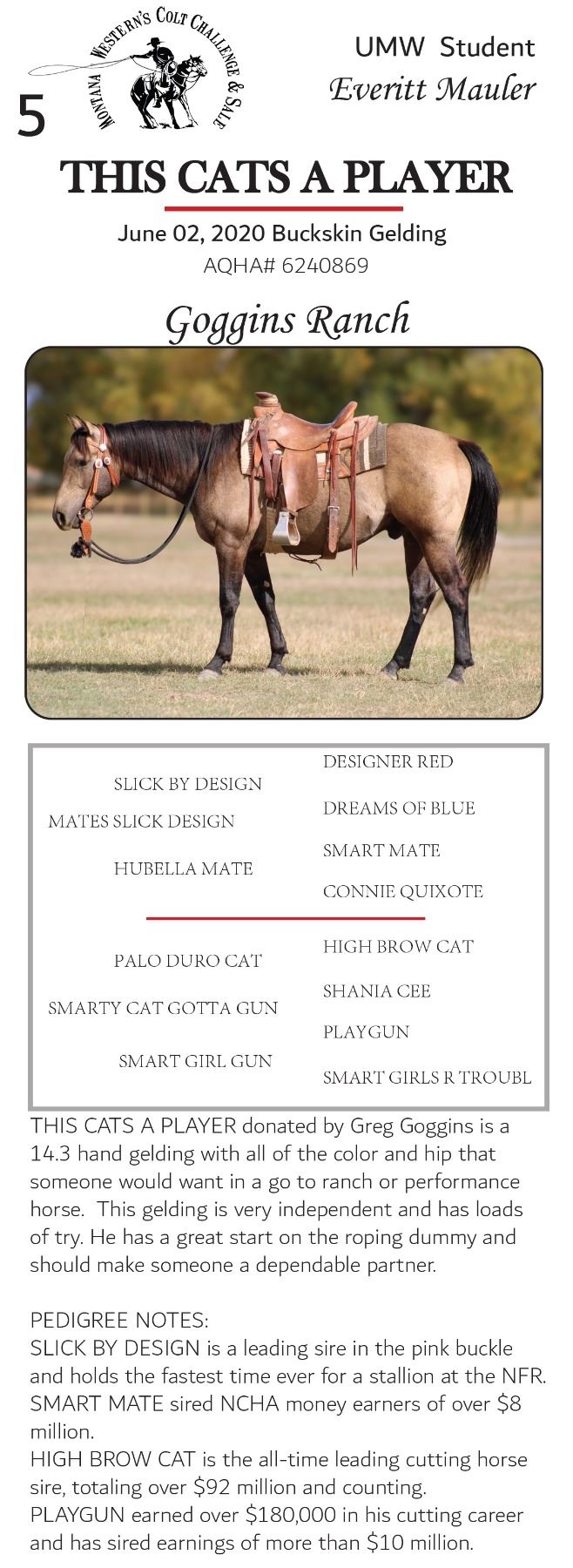 This Cats a Player donated by Greg Goggins is a 14.3 hand gelding with all of the color and hip that someone would want in a go to ranch or performance horse. This gelding is very independent and has loads of try. He has a great start on the roping dummy and should make someone a dependable partner.