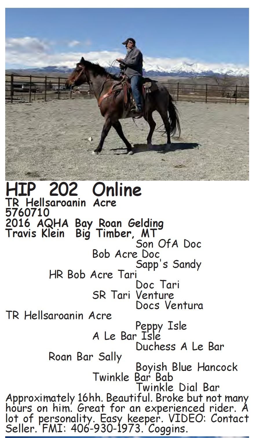TR Hellsaroanin Acre - 5760710 - 2016 AQHA Bay Roan Gelding - Travis Klein, Big Timber, MT - Approximately 16hh. Beautiful. Broke but not many hours on him. Great for an experienced rider. A lot of personality. Easy keeper. VIDEO: Contact Seller. FMI: 406-930-1973. Coggins.