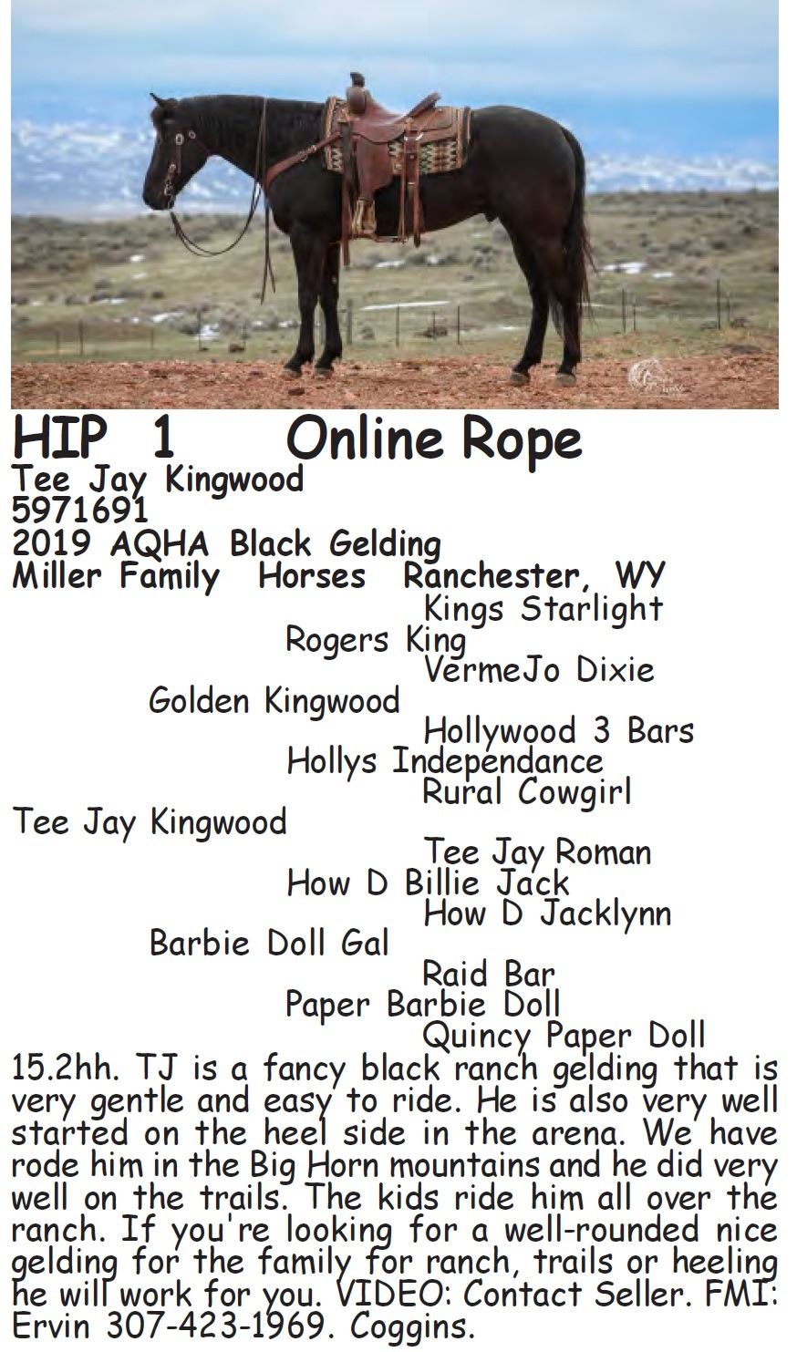 Tee Jay Kingwood - 5971691 - 2019 AQHA Black Gelding - Miller Family Horses, Ranchester, WY - 15.2hh. TJ is a fancy black ranch gelding that is very gentle and easy to ride. He is also very well started on the heel side in the arena. We have rode him in the Big Horn mountains and he did very well on the trails. The kids ride him all over the ranch. If you're looking for a well-rounded nice gelding for the family for ranch, trails or heeling he will work for you. VIDEO: Contact Seller. FMI: Ervin 307-423-1969. Coggins.