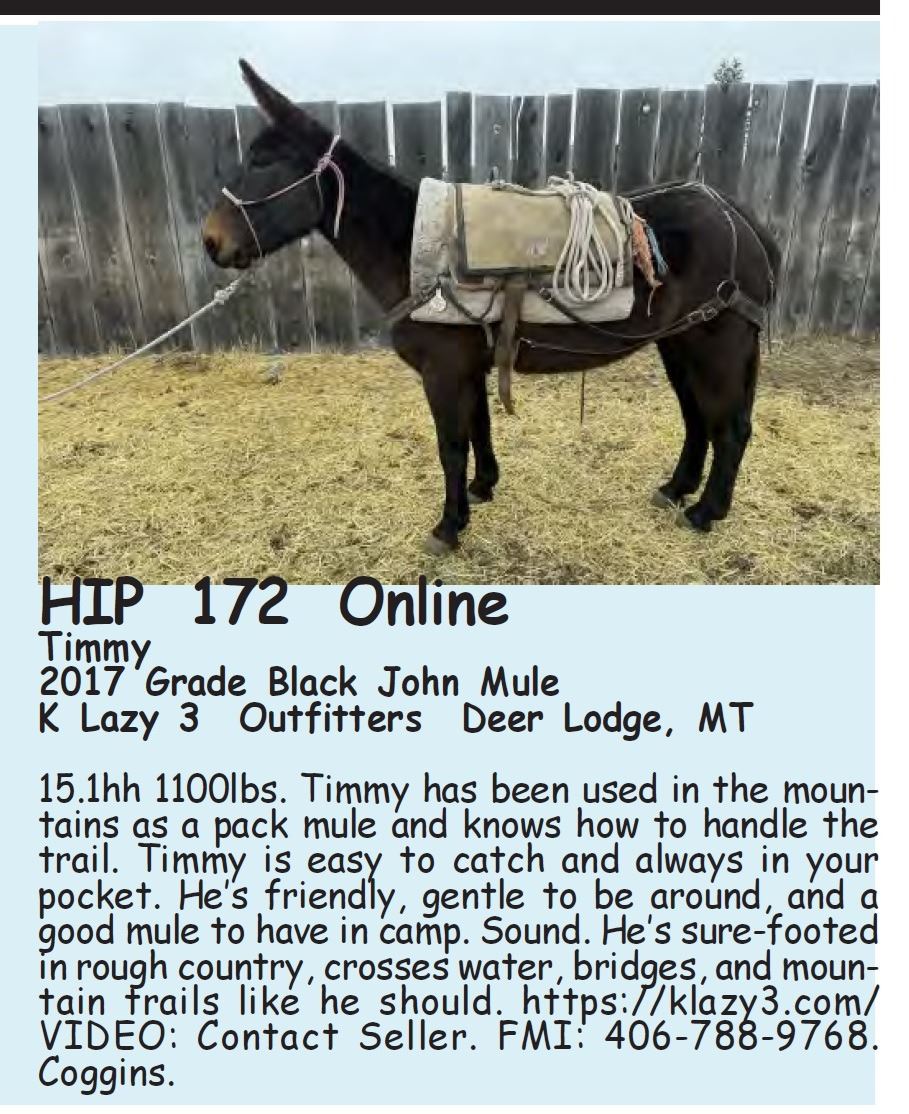 Timmy - 2017 Grade Black John Mule - K Lazy 3 Outfitters, Deer Lodge, MT - 15.1hh 1100lbs. Timmy has been used in the mountains as a pack mule and knows how to handle the trail. Timmy is easy to catch and always in your pocket. He’s friendly, gentle to be around, and a good mule to have in camp. Sound. He’s sure-footed in rough country, crosses water, bridges, and mountain trails like he should. https://klazy3.com/ VIDEO: Contact Seller. FMI: 406-788-9768. Coggins.