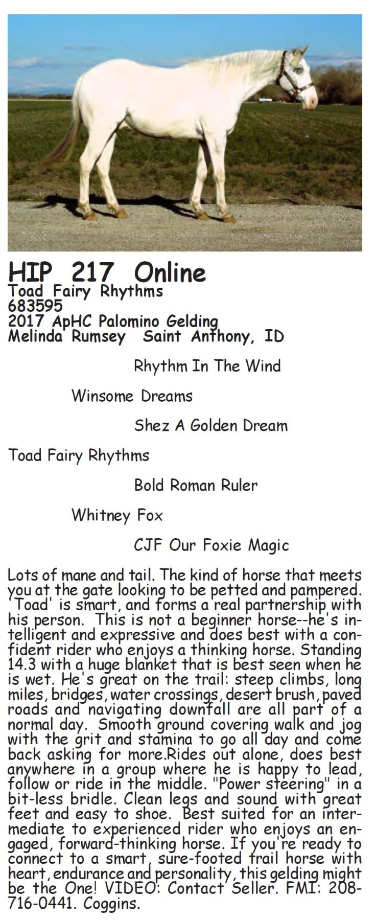 Toad Fairy Rhythms - 683595 - 2017 ApHC Palomino Gelding - Melinda Rumsey, Saint Anthony, ID - Lots of mane and tail. The kind of horse that meets you at the gate looking to be petted and pampered. 'Toad' is smart, and forms a real partnership with his person. This is not a beginner horse--he's intelligent and expressive and does best with a confident rider who enjoys a thinking horse. Standing 14.3 with a huge blanket that is best seen when he is wet. He's great on the trail: steep climbs, long miles, bridges, water crossings, desert brush, paved roads and navigating downfall are all part of a normal day. Smooth ground covering walk and jog with the grit and stamina to go all day and come back asking for more.Rides out alone, does best anywhere in a group where he is happy to lead, follow or ride in the middle. "Power steering" in a bit-less bridle. Clean legs and sound with great feet and easy to shoe. Best suited for an intermediate to experienced rider who enjoys an engaged, forward-thinking horse. If you're ready to connect to a smart, sure-footed trail horse with heart, endurance and personality, this gelding might be the One! VIDEO: Contact Seller. FMI: 208-716-0441. Coggins.
