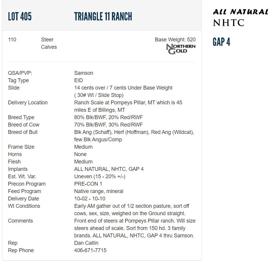 Comments Front end of steers at Pompeys Pillar ranch. Will size steers ahead of scale. Sort from 150 hd. 3 family brands. ALL NATURAL, NHTC, GAP 4 thru Samson. Can make all Blk/BWF at Buyer's Request.