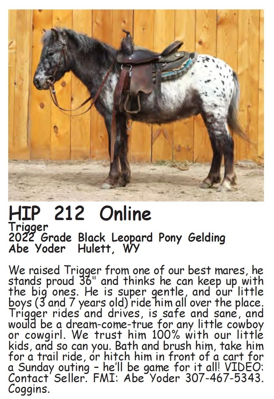 Trigger - 2022 Grade Black Leopard Pony Gelding - Abe Yoder, Hulett, WY - We raised Trigger from one of our best mares, he stands proud 36" and thinks he can keep up with the big ones. He is super gentle, and our little boys (3 and 7 years old) ride him all over the place. Trigger rides and drives, is safe and sane, and would be a dream-come-true for any little cowboy or cowgirl. We trust him 100% with our little kids, and so can you. Bath and brush him, take him for a trail ride, or hitch him in front of a cart for a Sunday outing – he’ll be game for it all! VIDEO: Contact Seller. FMI: Abe Yoder 307-467-5343. Coggins.