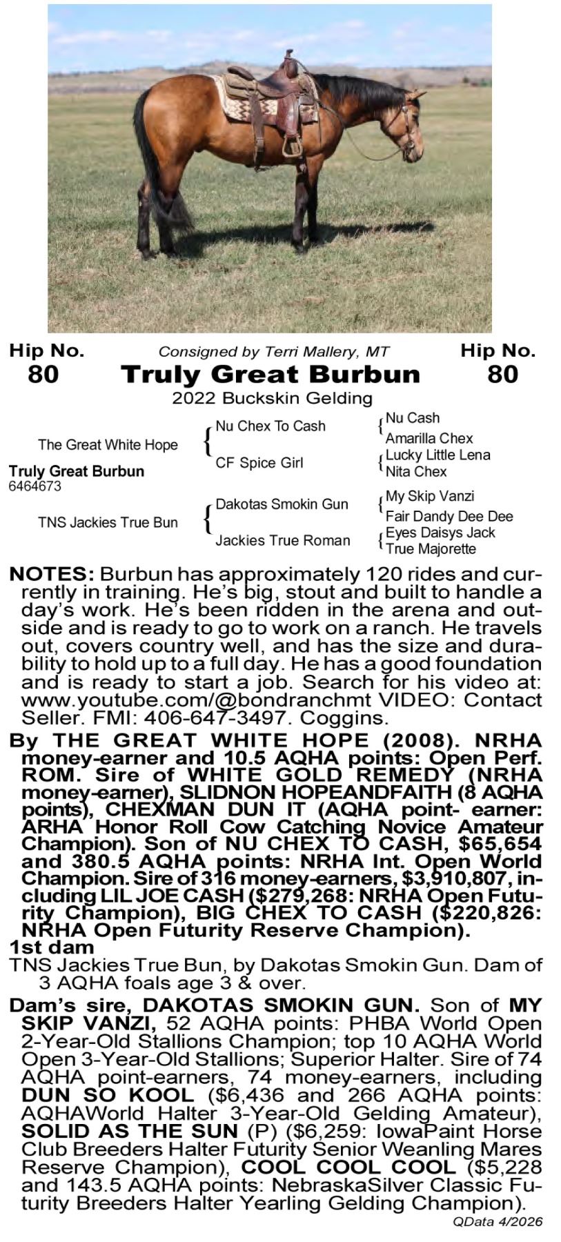 Truly Great Burbun -6464673 - 2022 AQHA Buckskin Gelding - Terri Mallery, Worden, MT - Burbun has approximately 120 rides and currently in training. He’s big, stout and built to handle a day’s work. He’s been ridden in the arena and outside and is ready to go to work on a ranch. He travels out, covers country well, and has the size and durability to hold up to a full day. He has a good foundation and is ready to start a job. Search for his video at: www.youtube.com/@bondranchmt VIDEO: Contact Seller. FMI: 406-647-3497. Coggins.