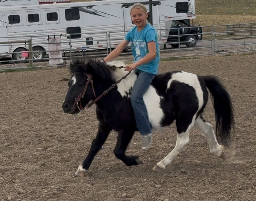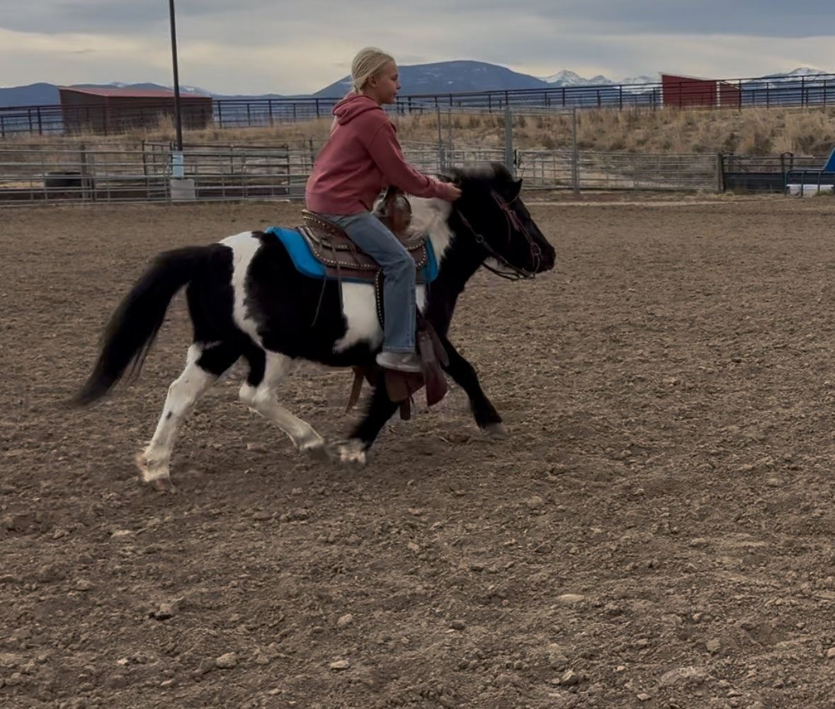 Meet Twig, a handsome black and white paint mini standing at 38 inches. He’s been a wonderful little companion and pasture buddy for the past few years and is now back in a 30-day refresher boot camp getting tuned up and ready for his next adventure! Twig is being ridden daily (except Sundays — his day of rest!) and is working on steering, loping, riding bareback, and plenty of other fun things that kids dream up when you’re not watching! He loads, ties, and trims. Twig is a cute, fun, and friendly little guy who’s sure to make someone smile every day. Whether you’re looking for a small riding pony, a lead-line pony, or a pasture pal with personality, Twig’s ready for it all! Will hold for 7 days after the sale and willing to meet buyer/hauler within 75 miles. LOCATION: Bozeman, MT. VIDEO: https://youtu.be/52rbECxzwc4?si=Otmo4eViaG6-Q1Ws FMI: 406-580-3299. Coggins.