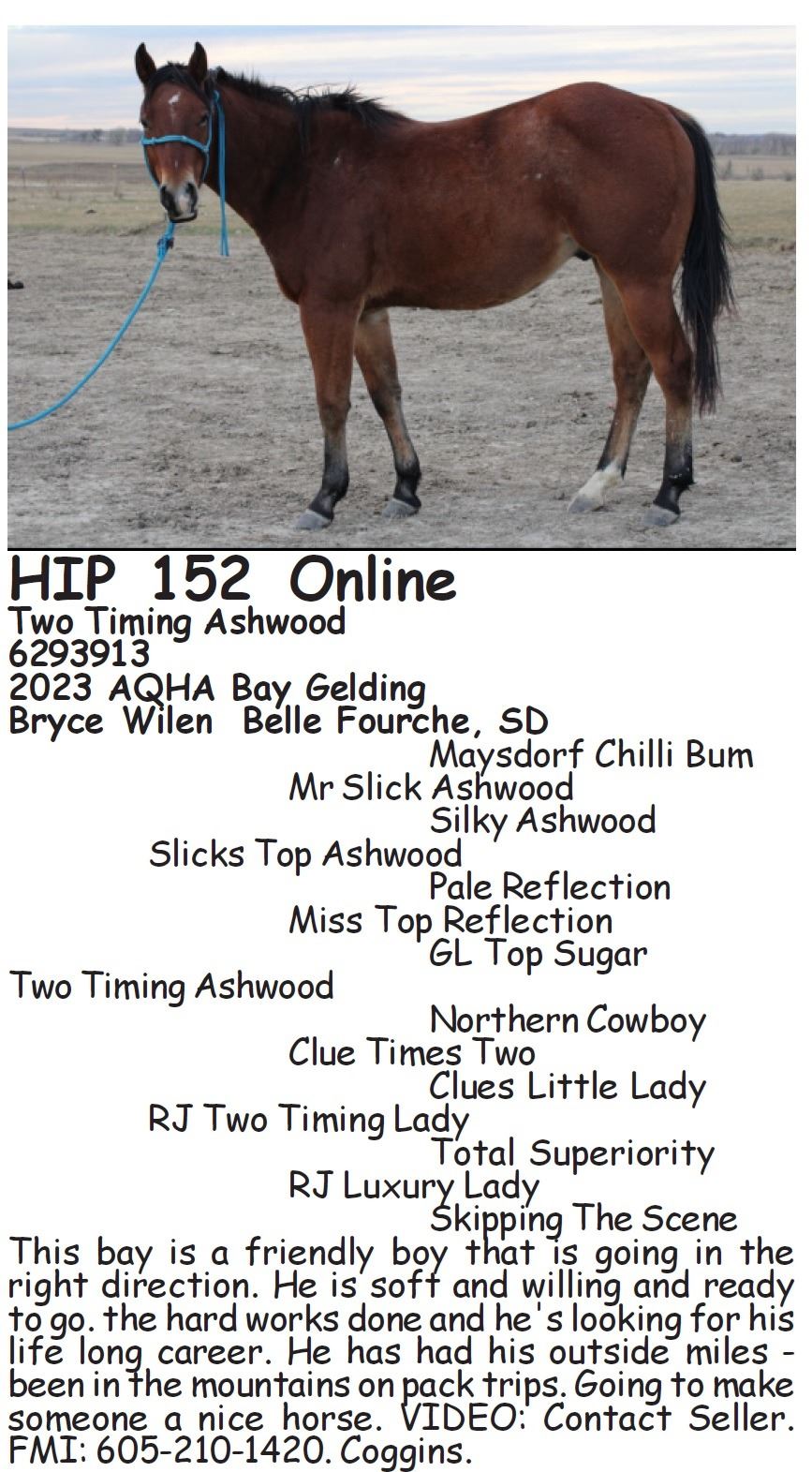 2023 AQHA Bay Gelding x Slicks Top Ashwood x Mr Slick Ashwood out of RJ Two Timing Lady x Clue Times Two. This bay is a friendly boy that is going in the right direction. He is soft and willing and ready to go. the hard works done and he's looking for his life long career. He has had his outside miles - been in the mountains on pack trips. Going to make someone a nice horse. VIDEO: Contact Seller. FMI: 605-210-1420. Coggins.