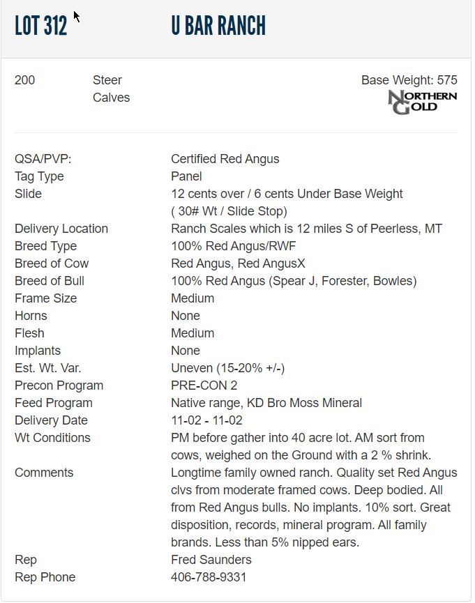 CommentsLongtime family owned ranch. Quality set Red Angus clvs from moderate framed cows. Deep bodied. All from Red Angus bulls. No implants. 10% sort. Great disposition, records, mineral program. All family brands. Less than 5% nipped ears.
