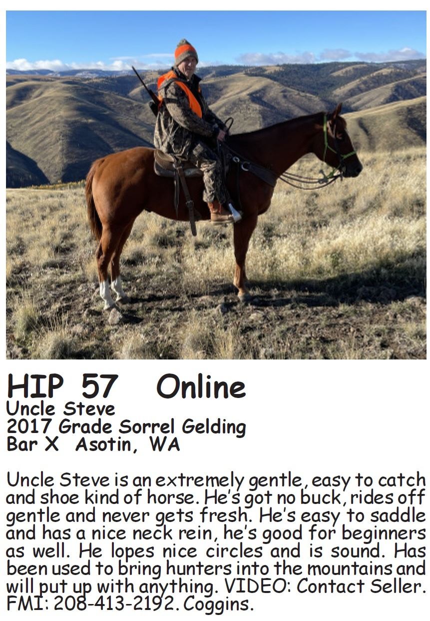 Uncle Steve is an extremely gentle, easy to catch and shoe kind of horse. He’s got no buck, rides off gentle and never gets fresh. He’s easy to saddle and has a nice neck rein, he’s good for beginners as well. He lopes nice circles and is sound. Has been used to bring hunters into the mountains and will put up with anything. VIDEO: Contact Seller. FMI: 208-413-2192. Coggins.