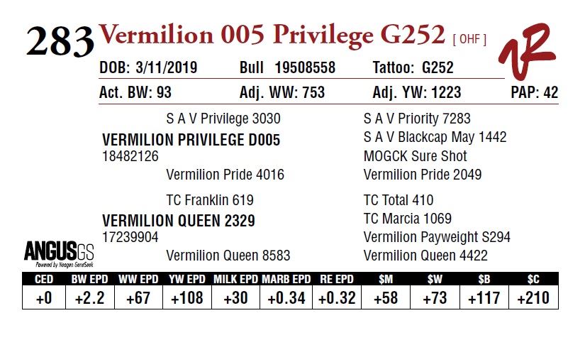 All bulls will be covered 50% by Vermilion Ranch if they are injured during their first breeding season. Breeding season is defined as the 60-day period following the first turnout of bulls.