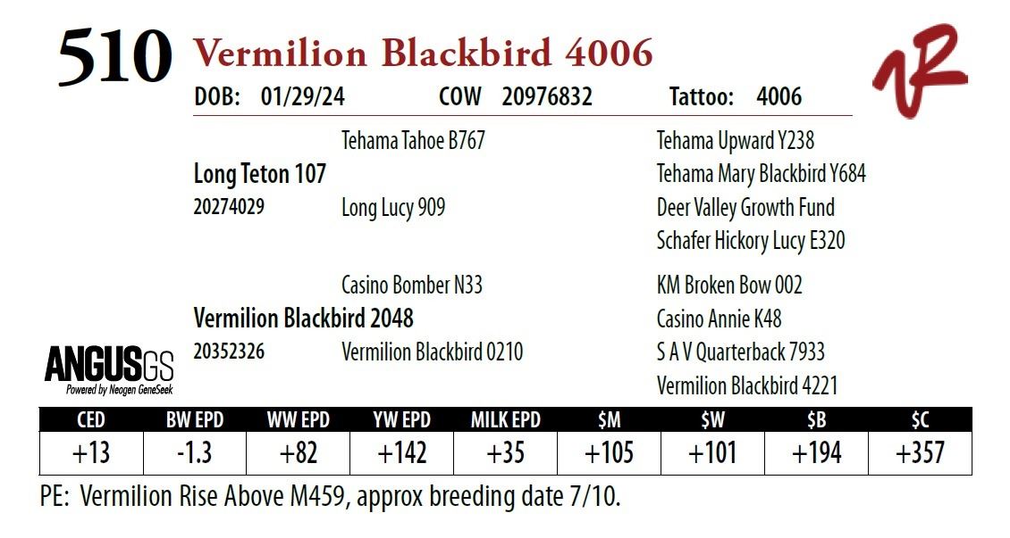 All bulls will be covered 50% by Vermilion Ranch if they are injured during their first breeding season. Breeding season is defined as the 60-day period following the first turnout of bulls.