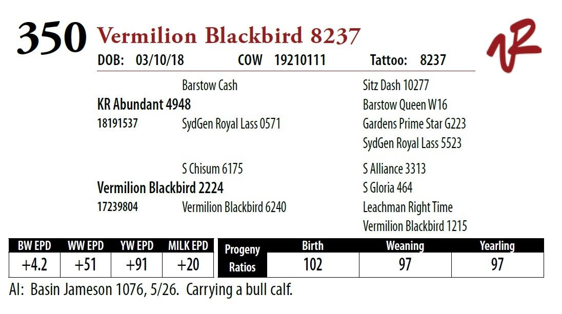 All bulls will be covered 50% by Vermilion Ranch if they are injured during their first breeding season. Breeding season is defined as the 60-day period following the first turnout of bulls.