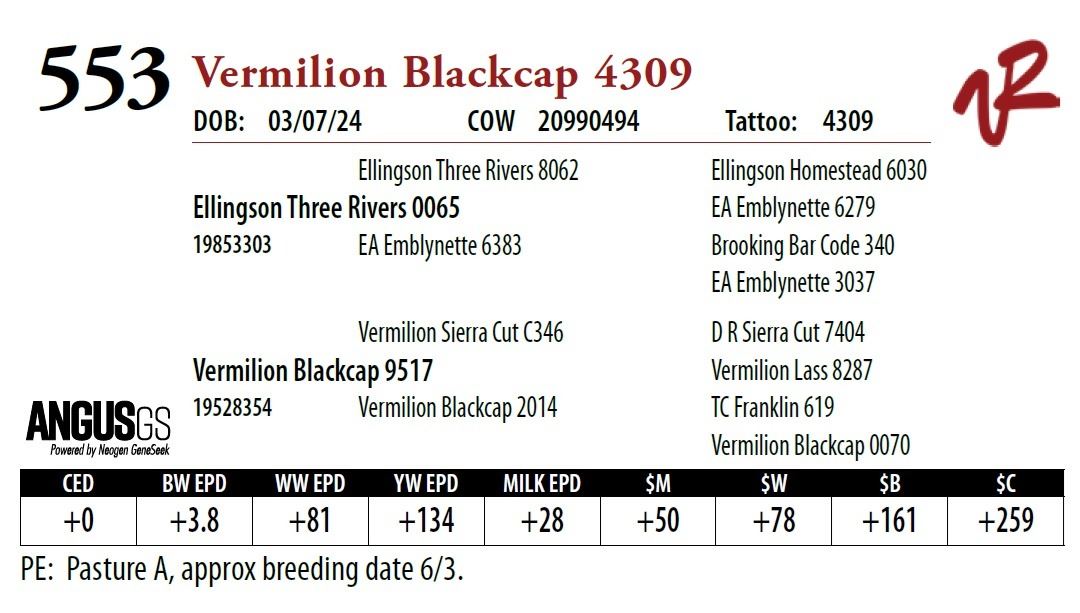 All bulls will be covered 50% by Vermilion Ranch if they are injured during their first breeding season. Breeding season is defined as the 60-day period following the first turnout of bulls.