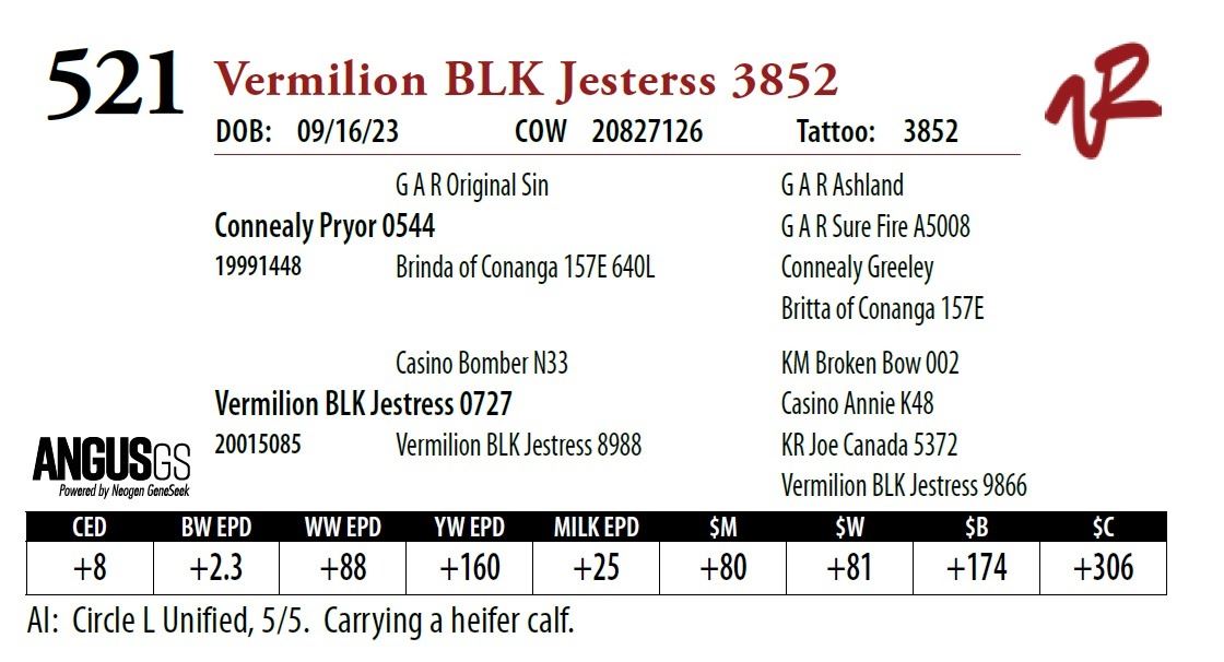 All bulls will be covered 50% by Vermilion Ranch if they are injured during their first breeding season. Breeding season is defined as the 60-day period following the first turnout of bulls.