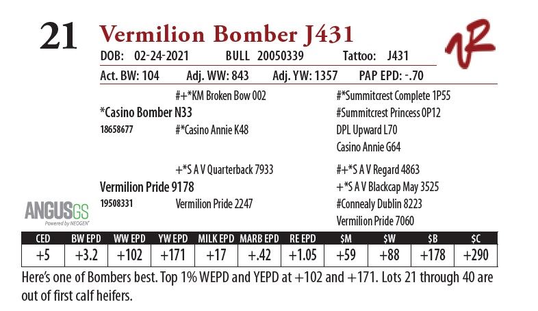 All bulls will be covered 50% by Vermilion Ranch if they are injured during their first breeding season. Breeding season is defined as the 60-day period following the first turnout of bulls.