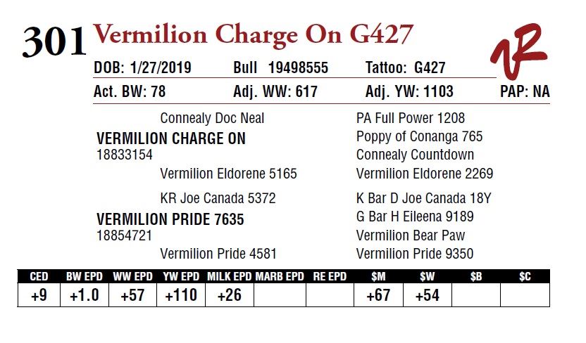 All bulls will be covered 50% by Vermilion Ranch if they are injured during their first breeding season. Breeding season is defined as the 60-day period following the first turnout of bulls.