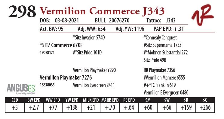 All bulls will be covered 50% by Vermilion Ranch if they are injured during their first breeding season. Breeding season is defined as the 60-day period following the first turnout of bulls.