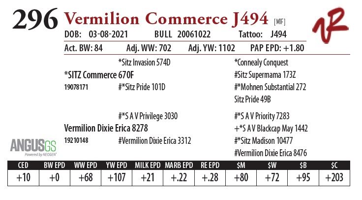 All bulls will be covered 50% by Vermilion Ranch if they are injured during their first breeding season. Breeding season is defined as the 60-day period following the first turnout of bulls.