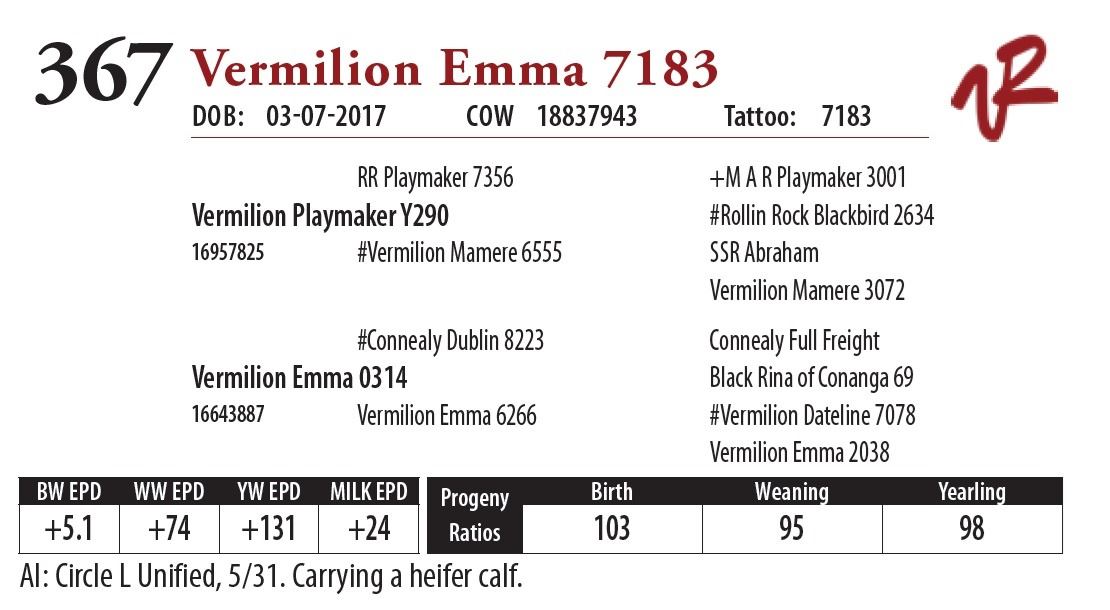 All bulls will be covered 50% by Vermilion Ranch if they are injured during their first breeding season. Breeding season is defined as the 60-day period following the first turnout of bulls.