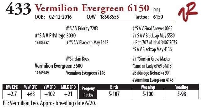 All bulls will be covered 50% by Vermilion Ranch if they are injured during their first breeding season. Breeding season is defined as the 60-day period following the first turnout of bulls.